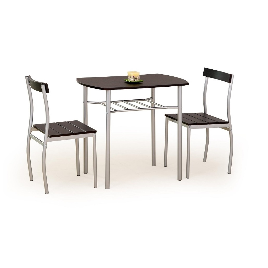 Set se skládá z oválného jídelního stolu a 2 židlí. Deska stolu je stejně jako sedák a opěrák židle vyrobena z dřevovláknitých desek. Konstrukce jsou z pevného kovu a zajistí tak výbornou stabilitu. Nosnost židlí v sestavě je 110 kg.