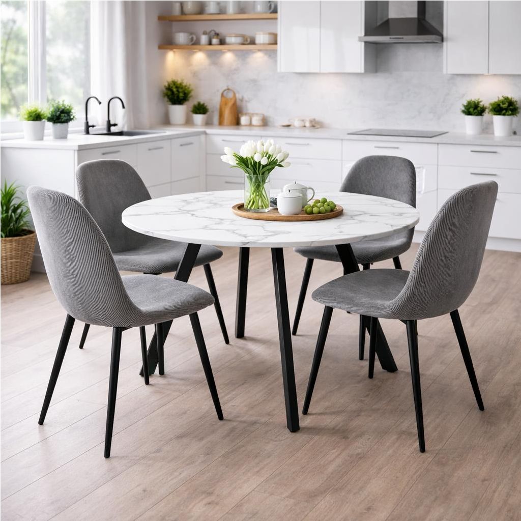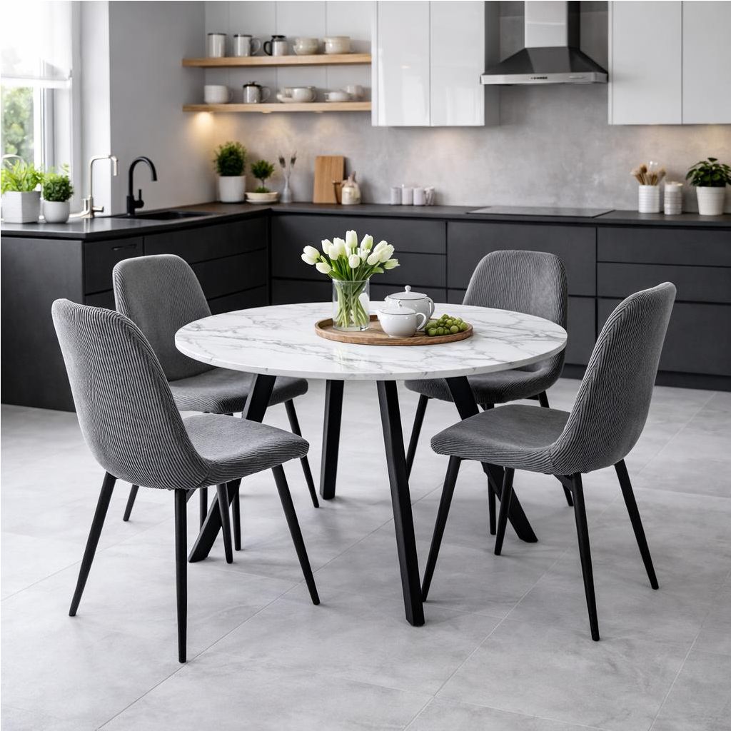 Židle v setu jsou navrženy pro pohodlí a odolnost. Ergonomicky tvarované sedáky a opěrky zad zajišťují komfort i při delším sezení, zatímco jejich nosnost až 130 kg poskytuje spolehlivost. Kovové nohy židlí doplňují moderní vzhled a stabilitu celého setu.