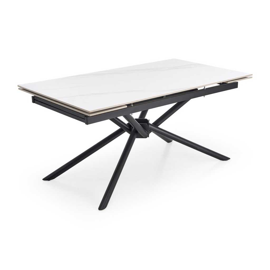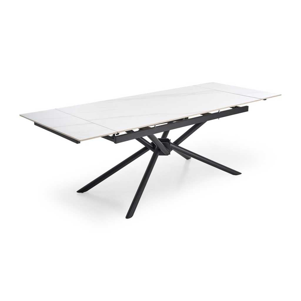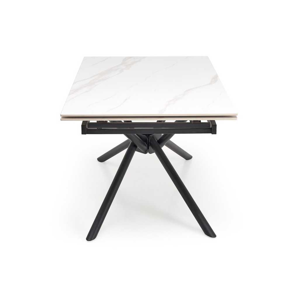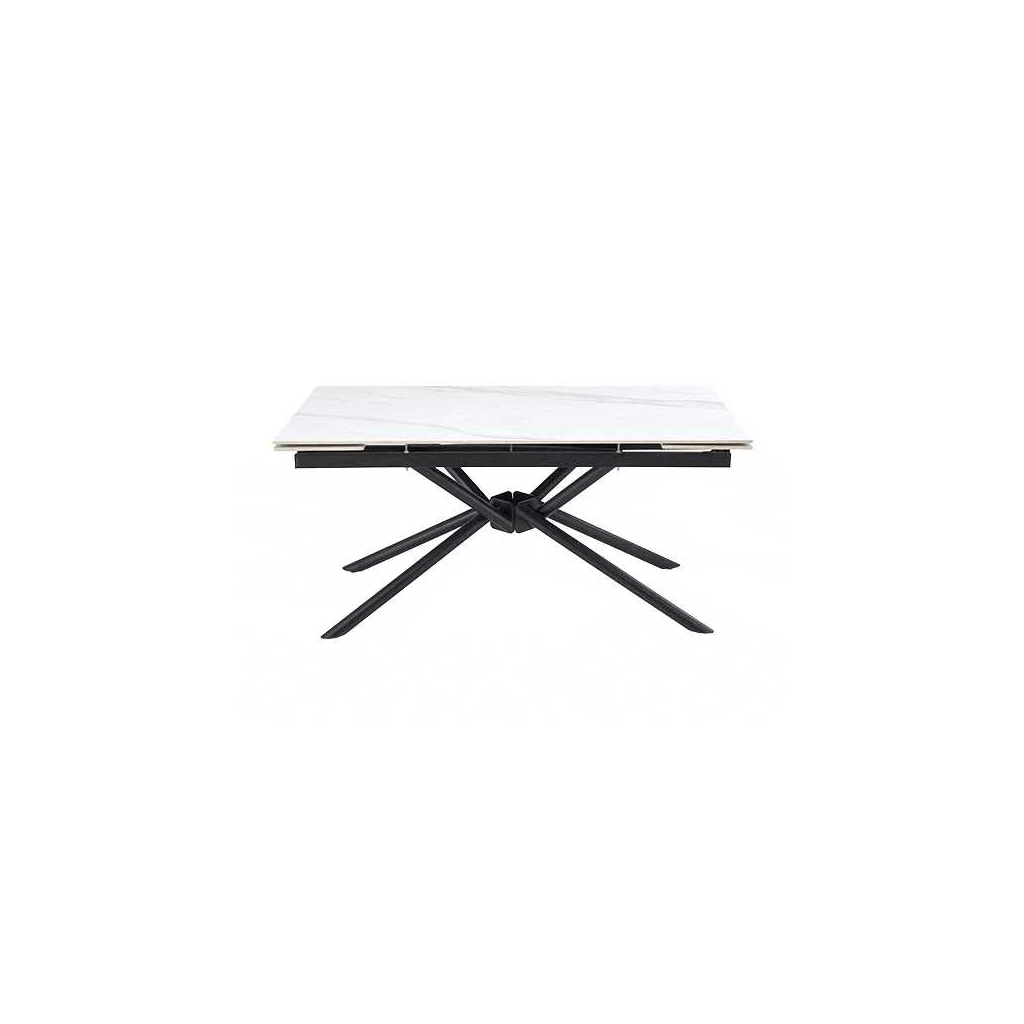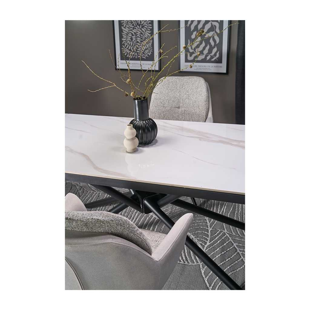 Deska stolu je vyrobená ze sintru, vizuálně úchvatný povrch vytváří dekor mramoru. Stabilitu a eleganci stolu dodává jeho podnož z práškované oceli, tvořená 4 nohami, které se kříží. Podnož je designovým prvkem a zároveň zajišťuje, že stůl je pevně ukotvený na podlaze. Celá konstrukce stolu je navržená tak, aby si hravě poradila s 60 kg nálože dobrot.