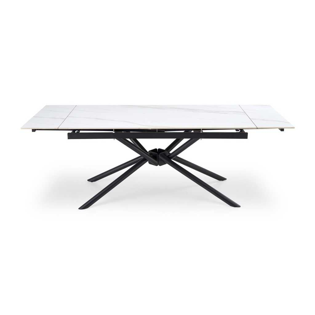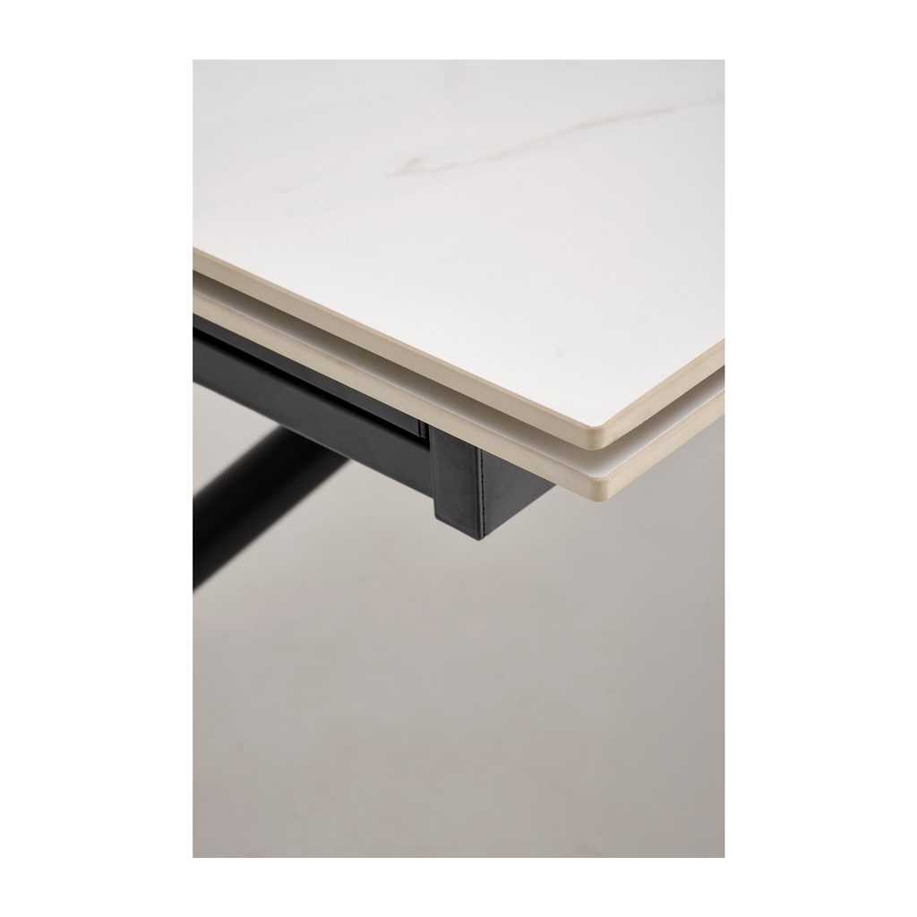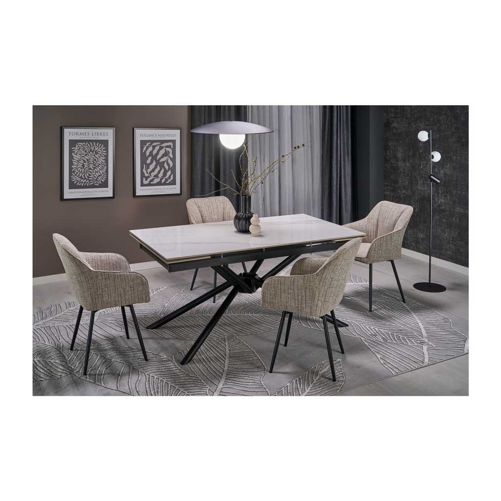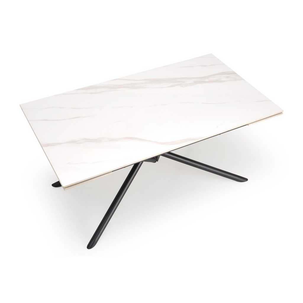 Deska stolu je vyrobená ze sintru, vizuálně úchvatný povrch vytváří dekor mramoru. Stabilitu a eleganci stolu dodává jeho podnož z práškované oceli, tvořená 4 nohami, které se kříží. Podnož je designovým prvkem a zároveň zajišťuje, že stůl je pevně ukotvený na podlaze. Celá konstrukce stolu je navržená tak, aby si hravě poradila s 60 kg nálože dobrot.
