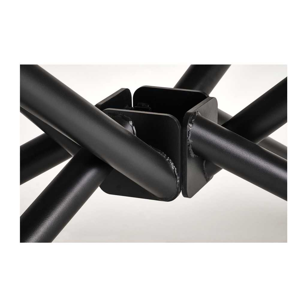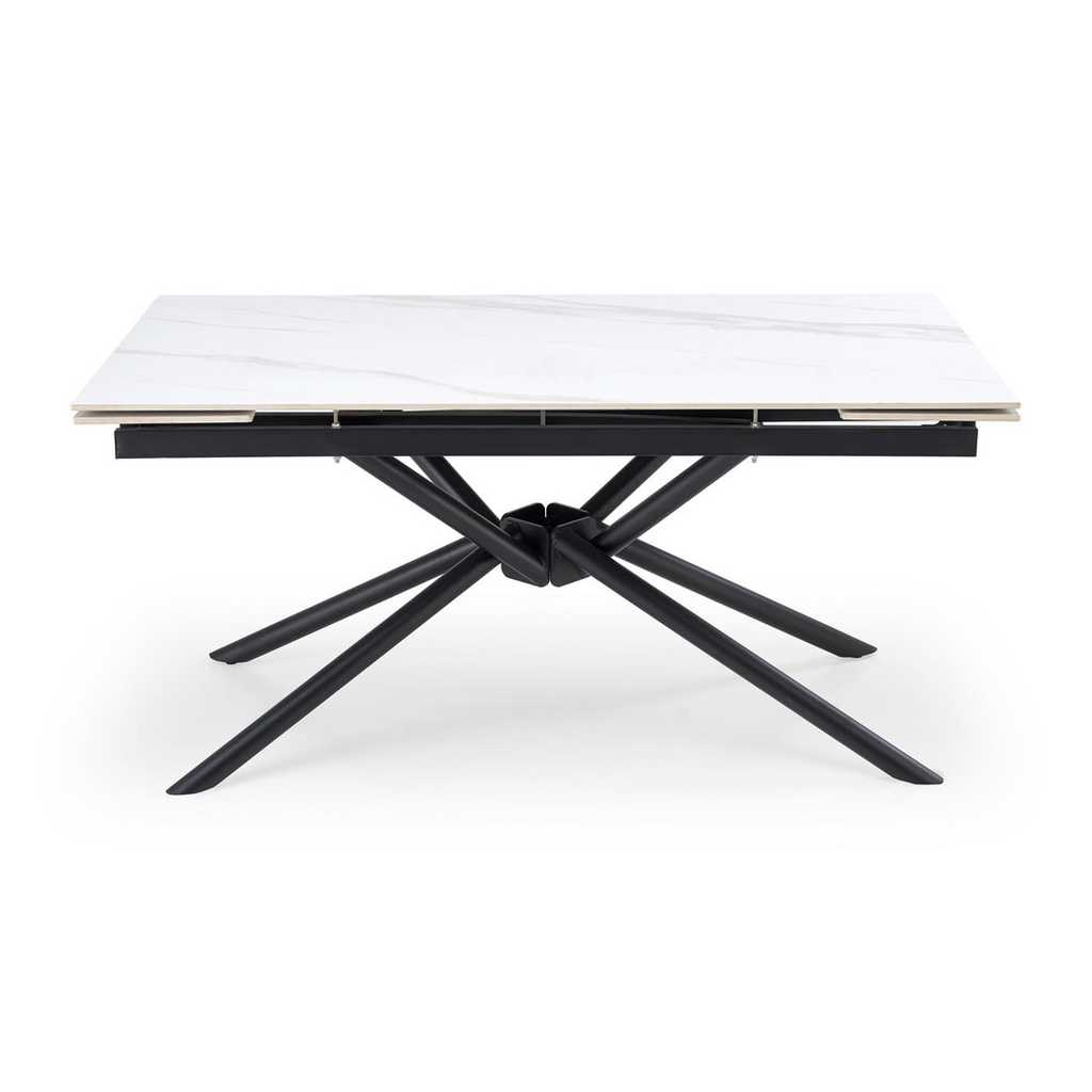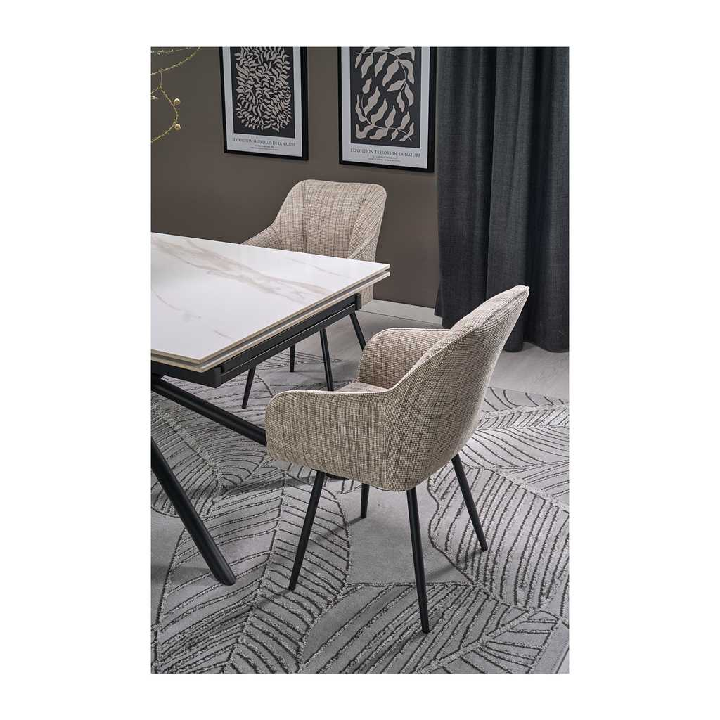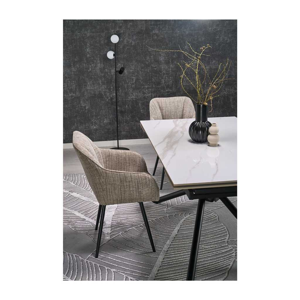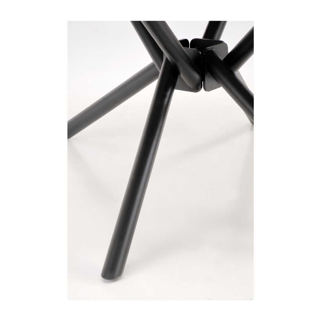 Deska stolu je vyrobená ze sintru, vizuálně úchvatný povrch vytváří dekor mramoru. Stabilitu a eleganci stolu dodává jeho podnož z práškované oceli, tvořená 4 nohami, které se kříží. Podnož je designovým prvkem a zároveň zajišťuje, že stůl je pevně ukotvený na podlaze. Celá konstrukce stolu je navržená tak, aby si hravě poradila s 60 kg nálože dobrot.
