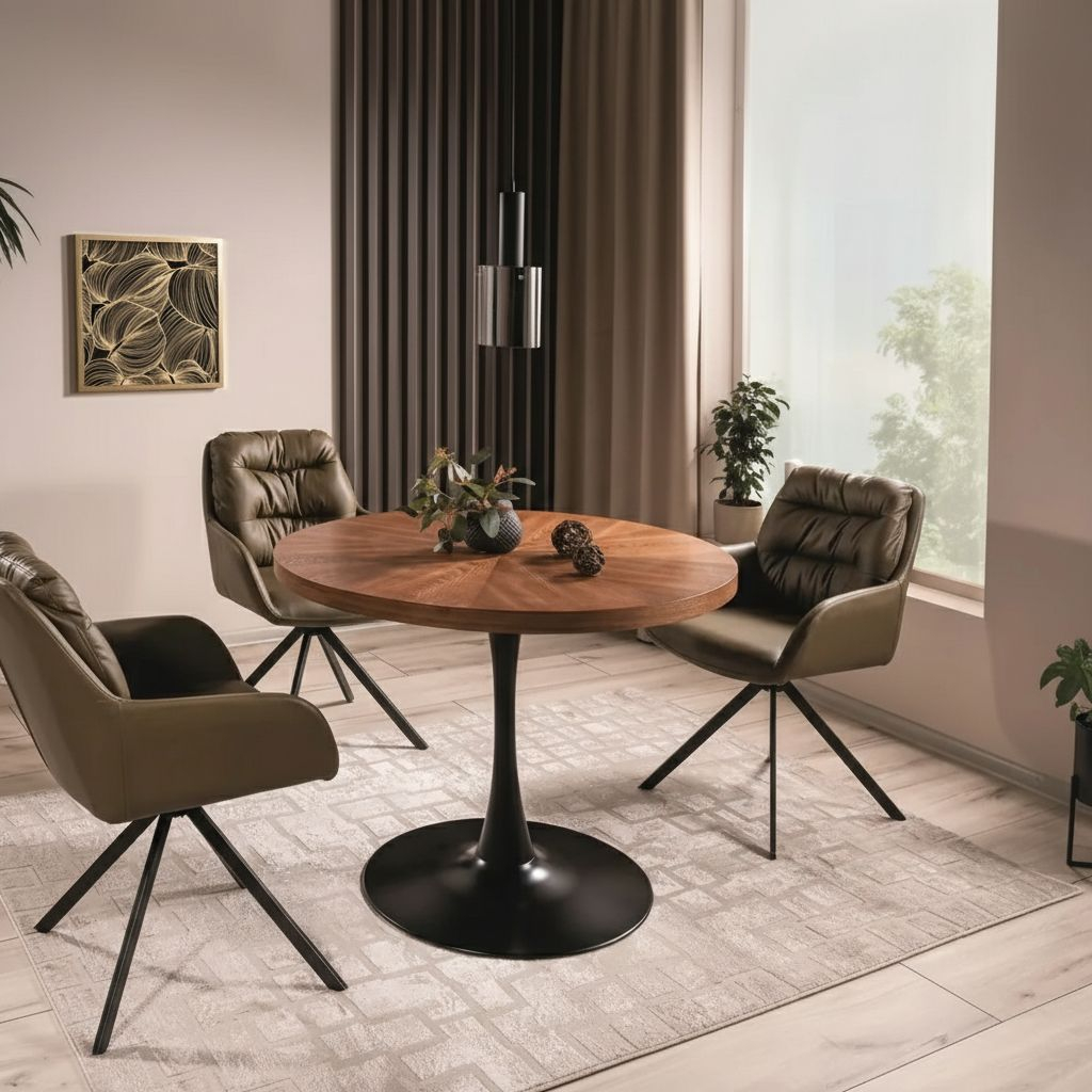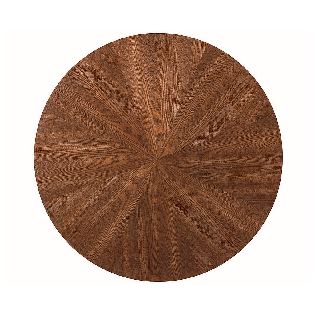 Kruhová deska vyrobená z MDF desek je potažená přírodní dýhou v dekoru ořechového dřeva, která dodává eleganci a teplo. S průměrem 100 cm je stůl kompaktní, ale poskytuje dostatek prostoru pro jídlo i interakci. Zajímavá kresba na desce jí propůjčuje unikátní vzhled.