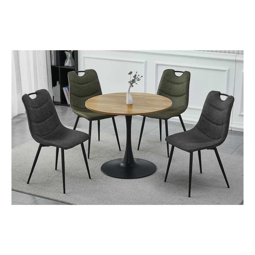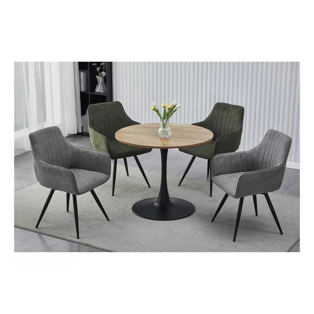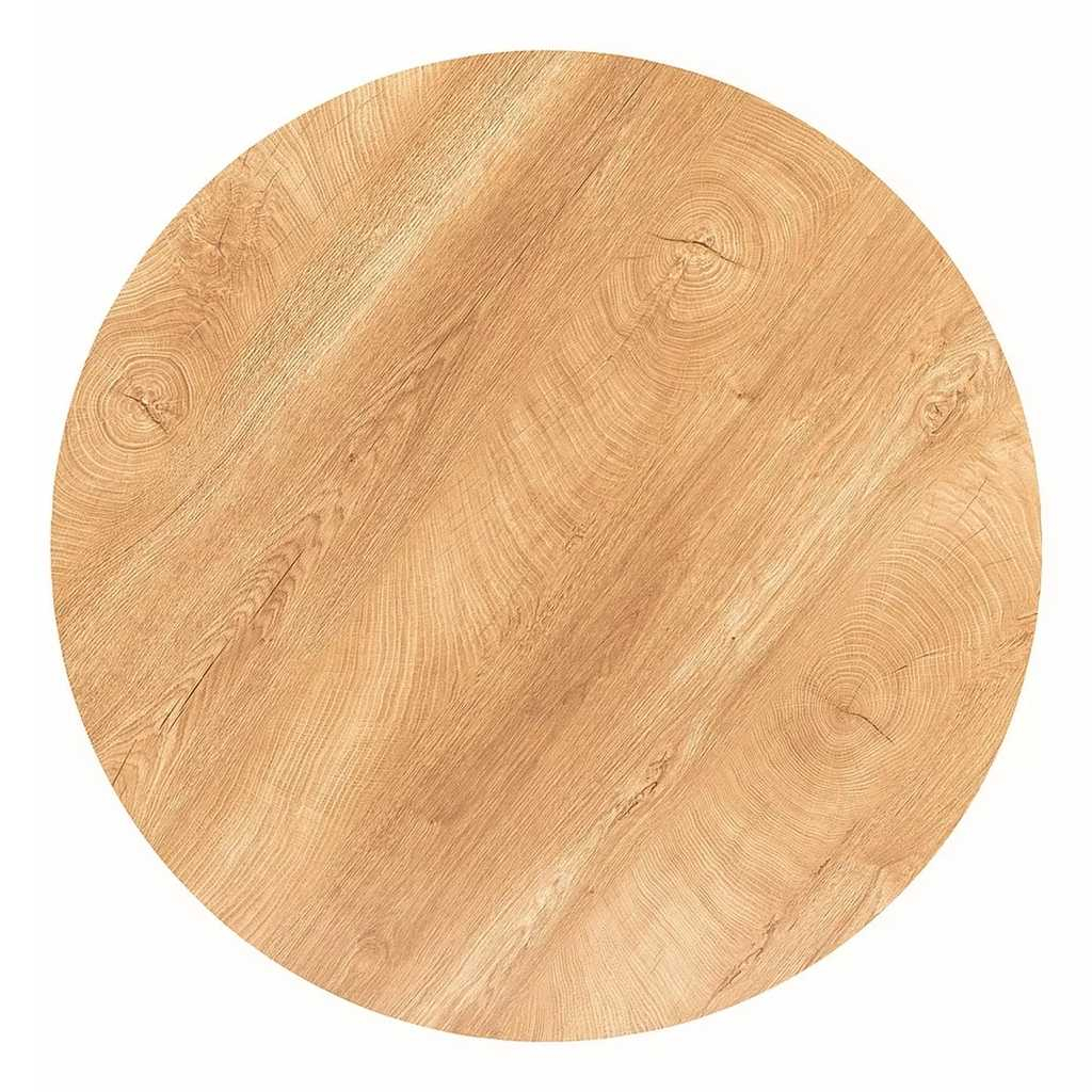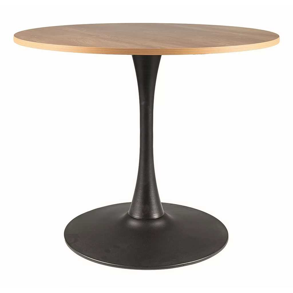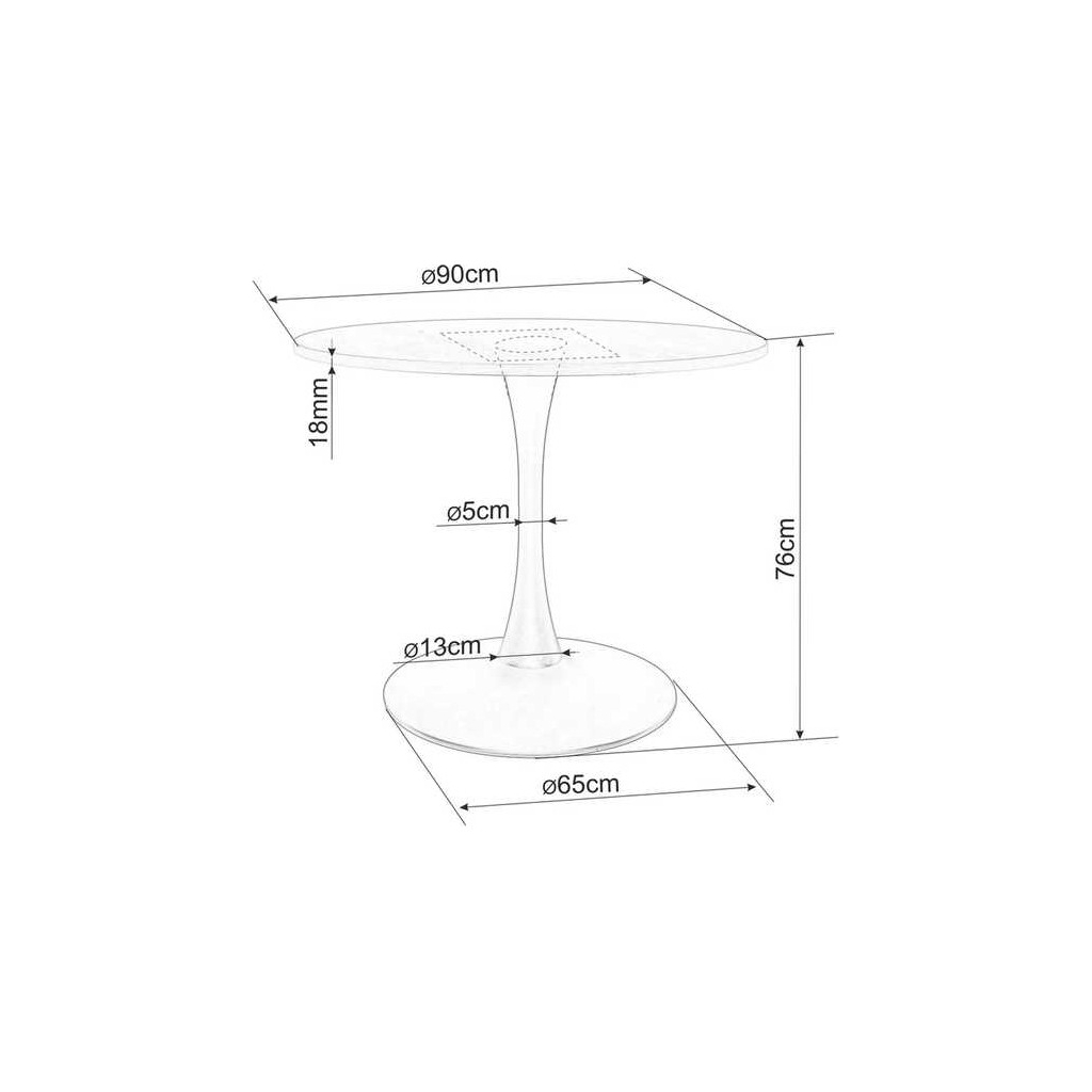 Horní desku tvoří kruh z laminovaného dřevovlákna (MDF) o síle 18 mm a průměru 90 cm. Ve výšce 76 cm ji drží stabilní podnož z práškované ocele, která je zároveň hlavním designovým prvkem stolu – tvoří ji široká základna (průměr 65 cm) a elegantní stopka.