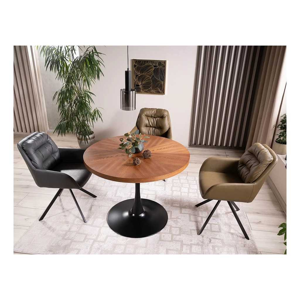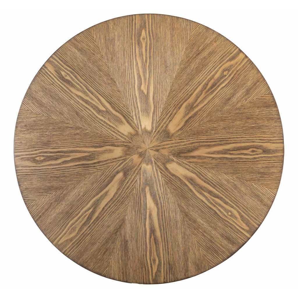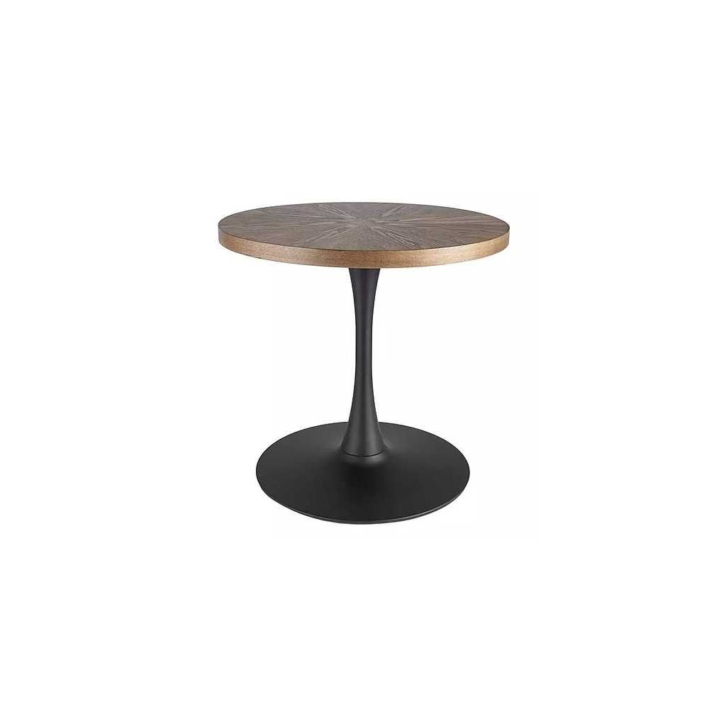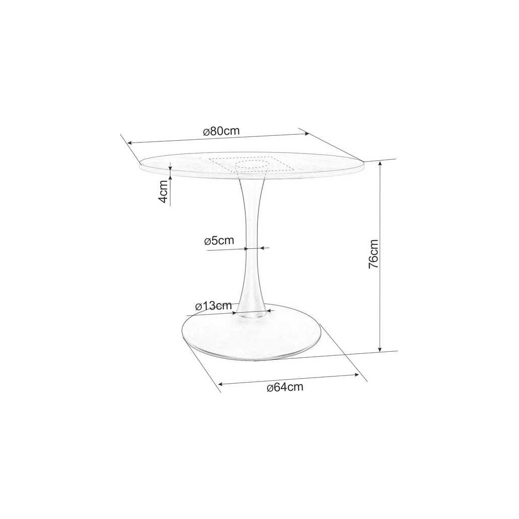 Horní desku tvoří kruh z dýhovaného dřevovlákna (MDF) o síle 40 mm a průměru 80 cm. Ve výšce 76 cm ji drží stabilní podnož z práškované ocele, která je zároveň hlavním designovým prvkem stolu – tvoří ji široká základna (průměr 64 cm) a elegantní stopka.