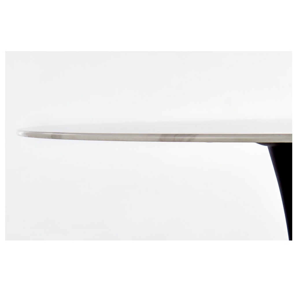 Stůl disponuje mohutnou kovovou nohou s rozšířenou podstavou, která celému stolu zajistí výbornou stabilitu. Horní deska je vyrobená ze skla s dekorem mramoru.