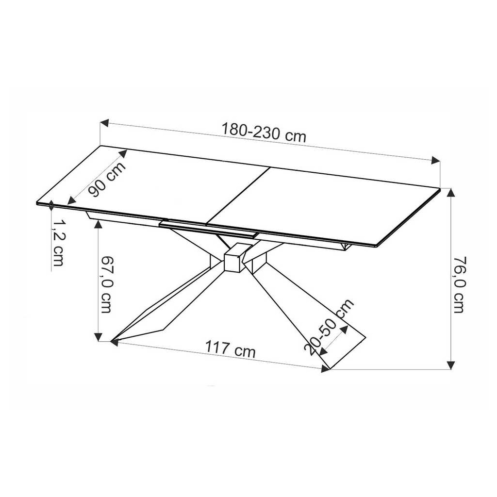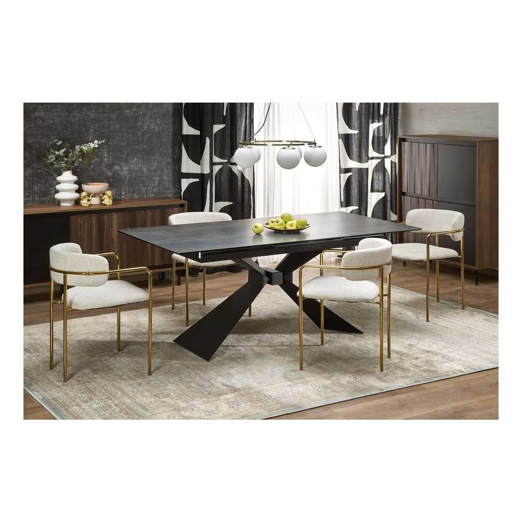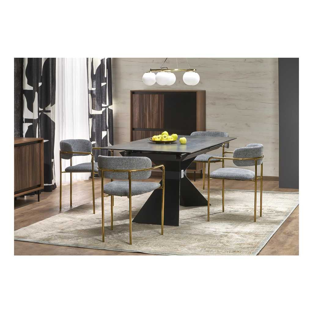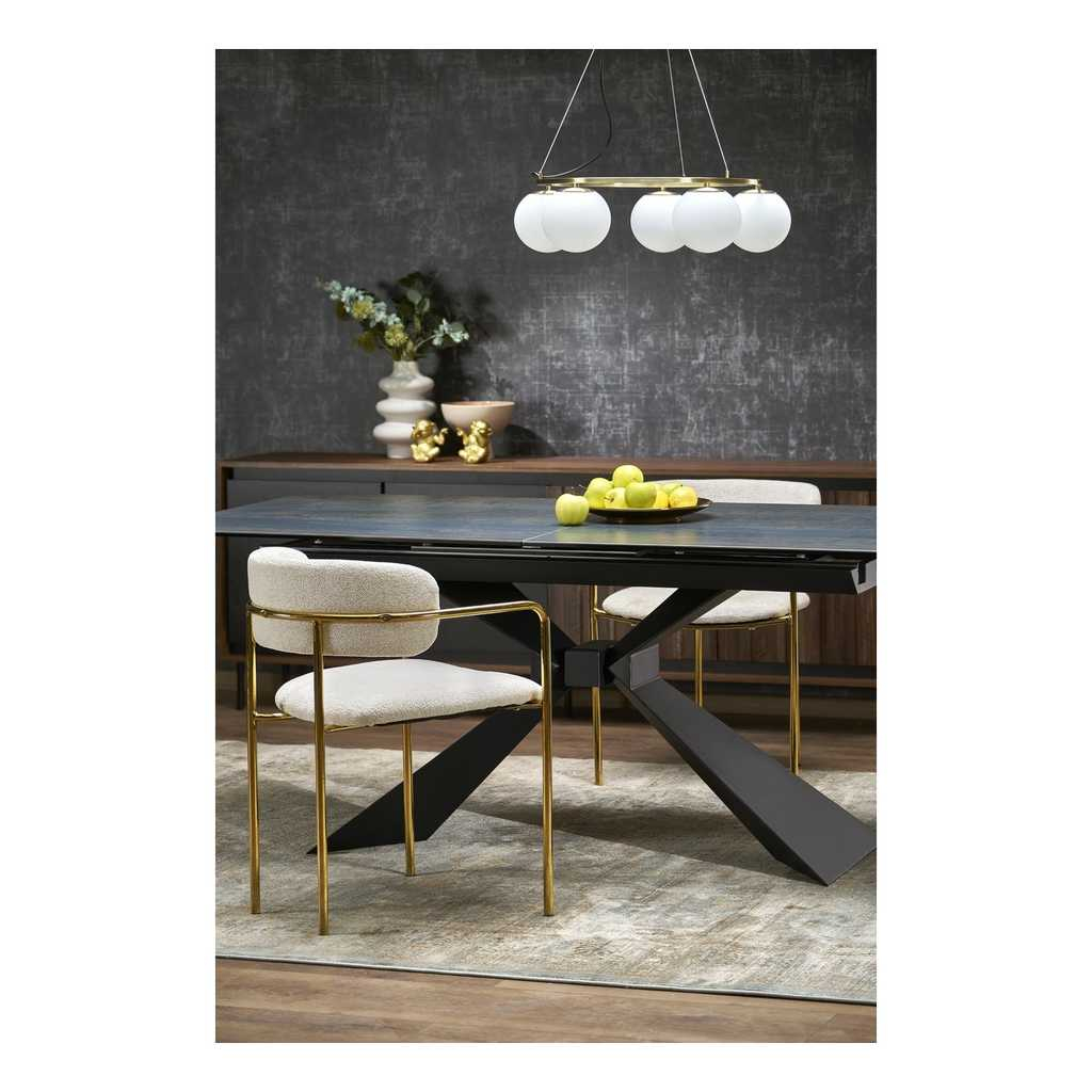 Deska stolu je vyrobena z kombinace keramiky a skla, což dodává stolu nejen honosný vzhled, ale také vynikající odolnost. Keramika je známá svou tvrdostí a odolností vůči poškrábání, zatímco sklo usnadňuje údržbu. Tento povrch je ideální pro každodenní používání, stejně jako pro speciální příležitosti.