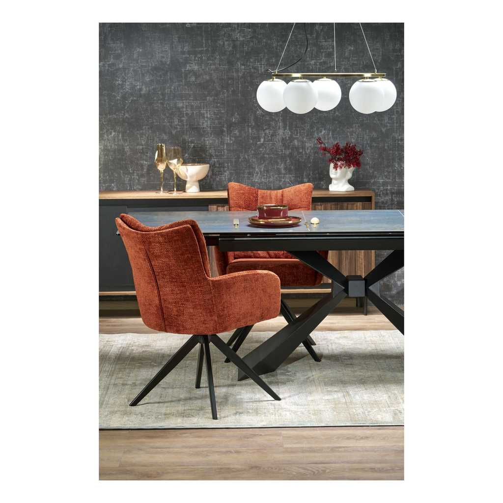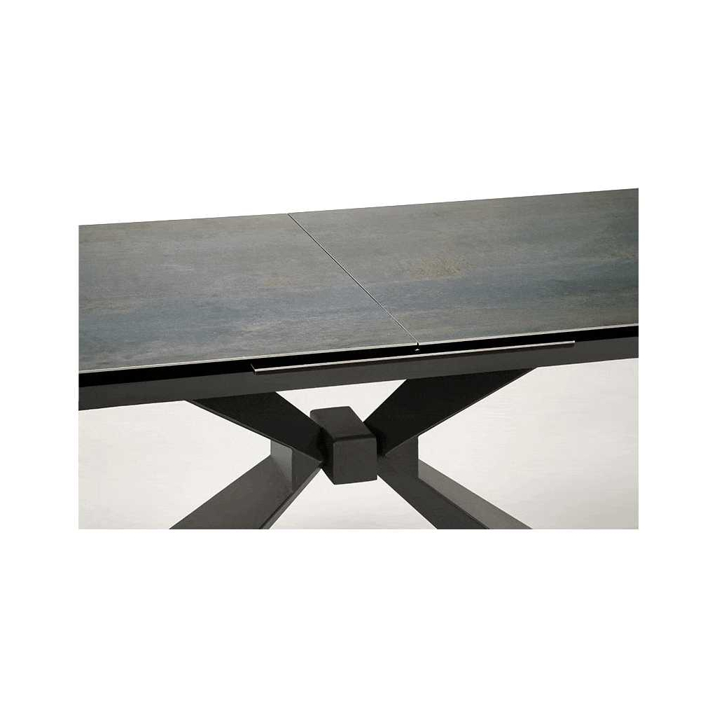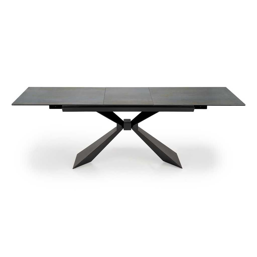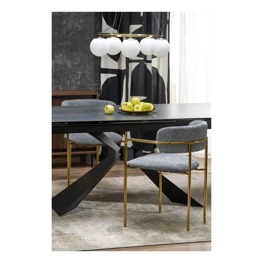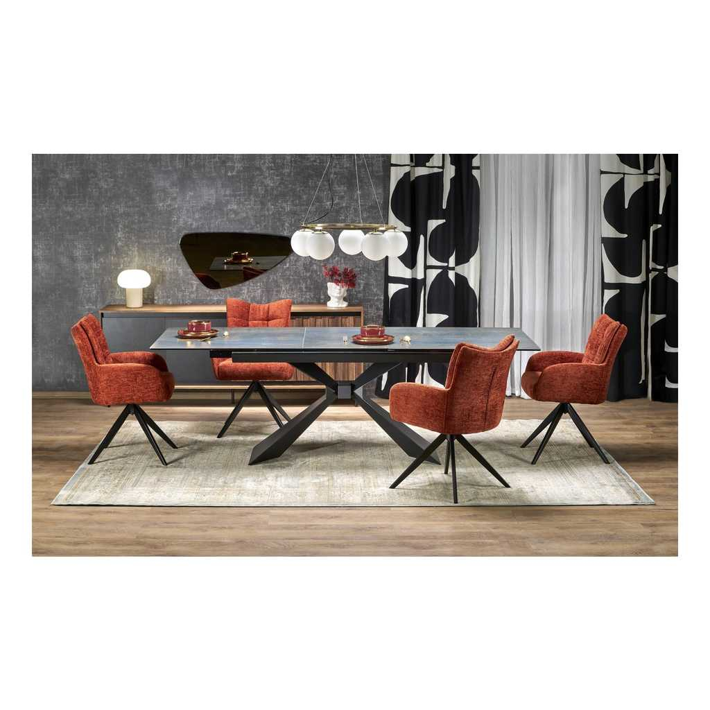 Deska stolu je vyrobena z kombinace keramiky a skla, což dodává stolu nejen honosný vzhled, ale také vynikající odolnost. Keramika je známá svou tvrdostí a odolností vůči poškrábání, zatímco sklo usnadňuje údržbu. Tento povrch je ideální pro každodenní používání, stejně jako pro speciální příležitosti.