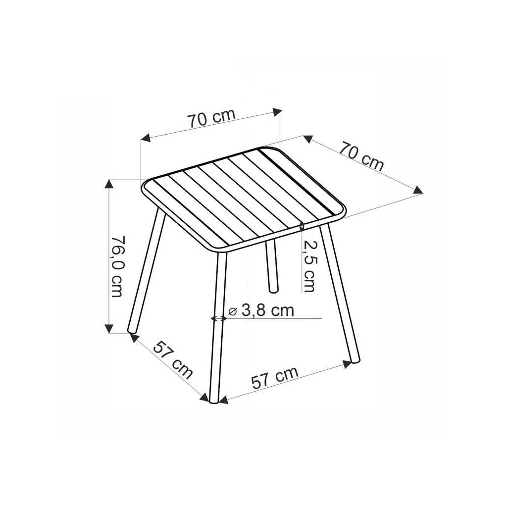 Deska stolu má rozměry 70 × 70 cm a jeho deska je ve výšce 76 cm. Ke stolu této velikosti se pohodlně usadí 4 osoby.