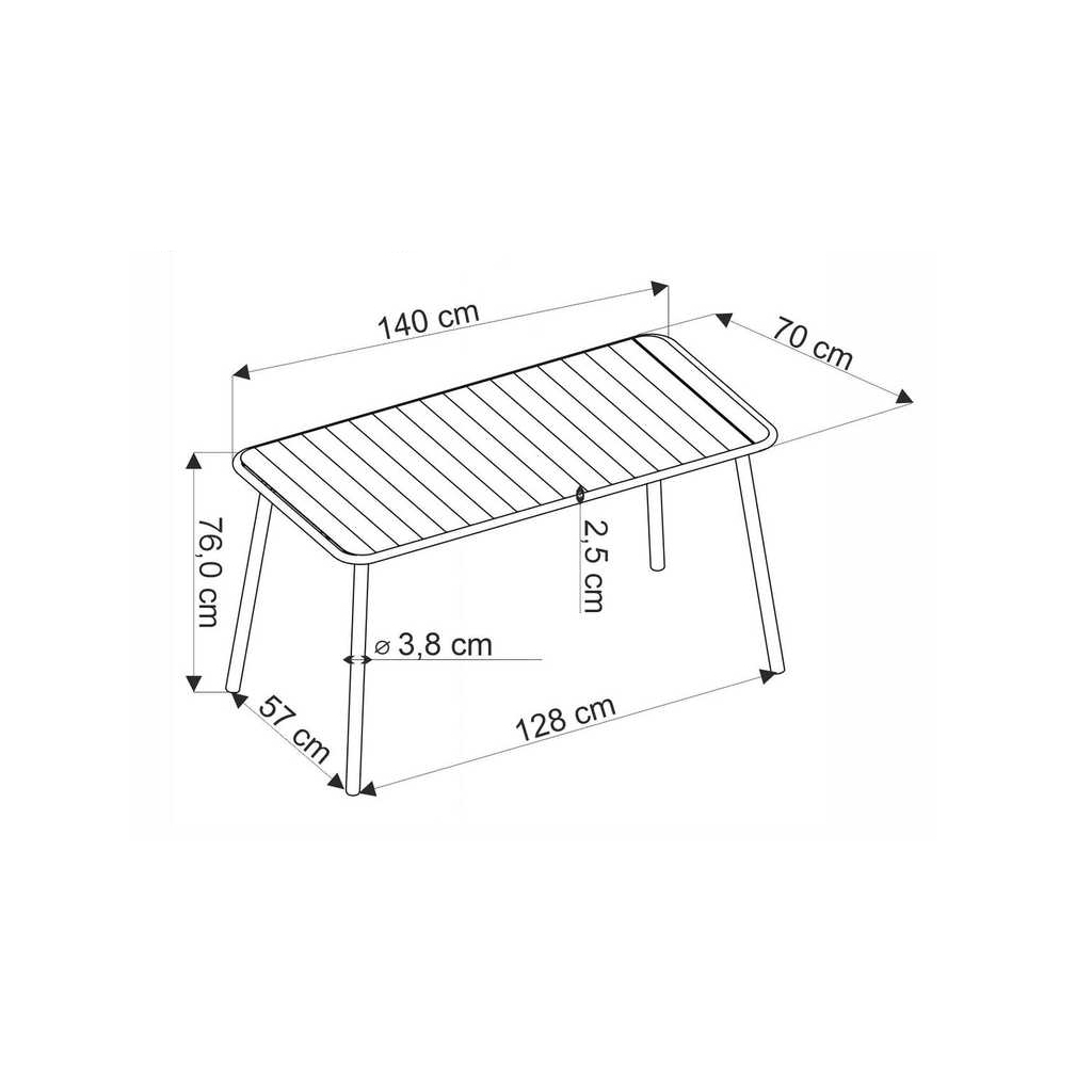 Deska stolu má rozměry 140 × 70 cm a jeho deska je ve výšce 76 cm. Ke stolu této velikosti se pohodlně usadí 6 osob.
