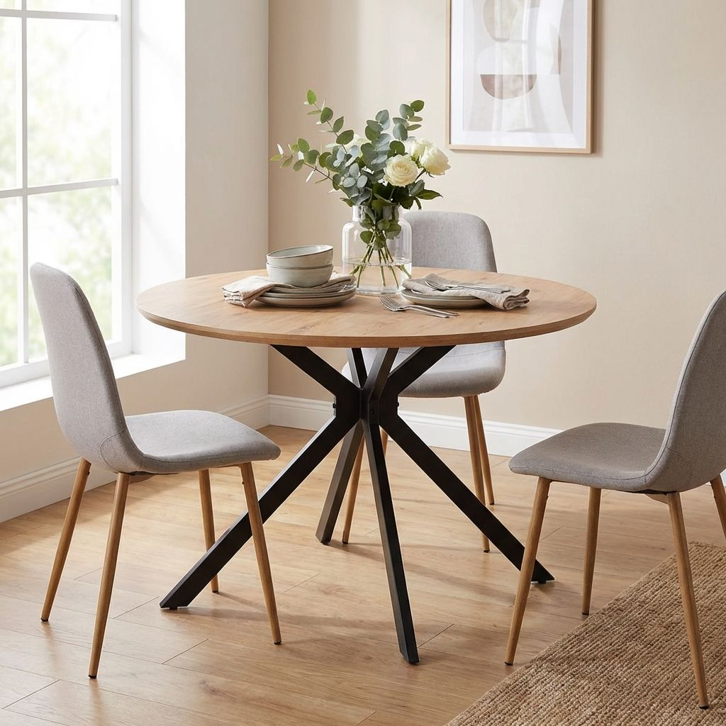 Horní kruhová deska je vyrobená z kombinace dřevovlákna a dýhy o tloušťce 1,8 cm. Zaručuje tak stabilitu a pevnost při každodenních úkonech. Tomuto dopomáhají také kovové nohy uspořádané neobvyklým způsobem. Vytváří tak prostor 74 cm mezi nohami stolu a zaručuje tak dostatečný prostor pro vaše nohy.