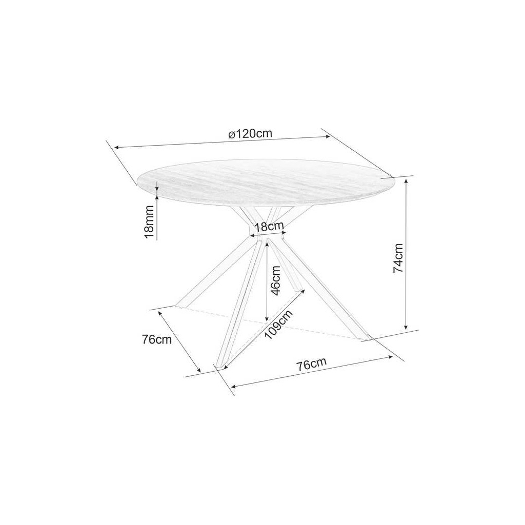 Horní kruhová deska je vyrobená z kombinace dřevovlákna a dýhy o tloušťce 1,8 cm. Zaručuje tak stabilitu a pevnost při každodenních úkonech. Tomuto dopomáhají také kovové nohy uspořádané neobvyklým způsobem. Vytváří tak prostor 74 cm mezi nohami stolu a zaručuje tak dostatečný prostor pro vaše nohy.