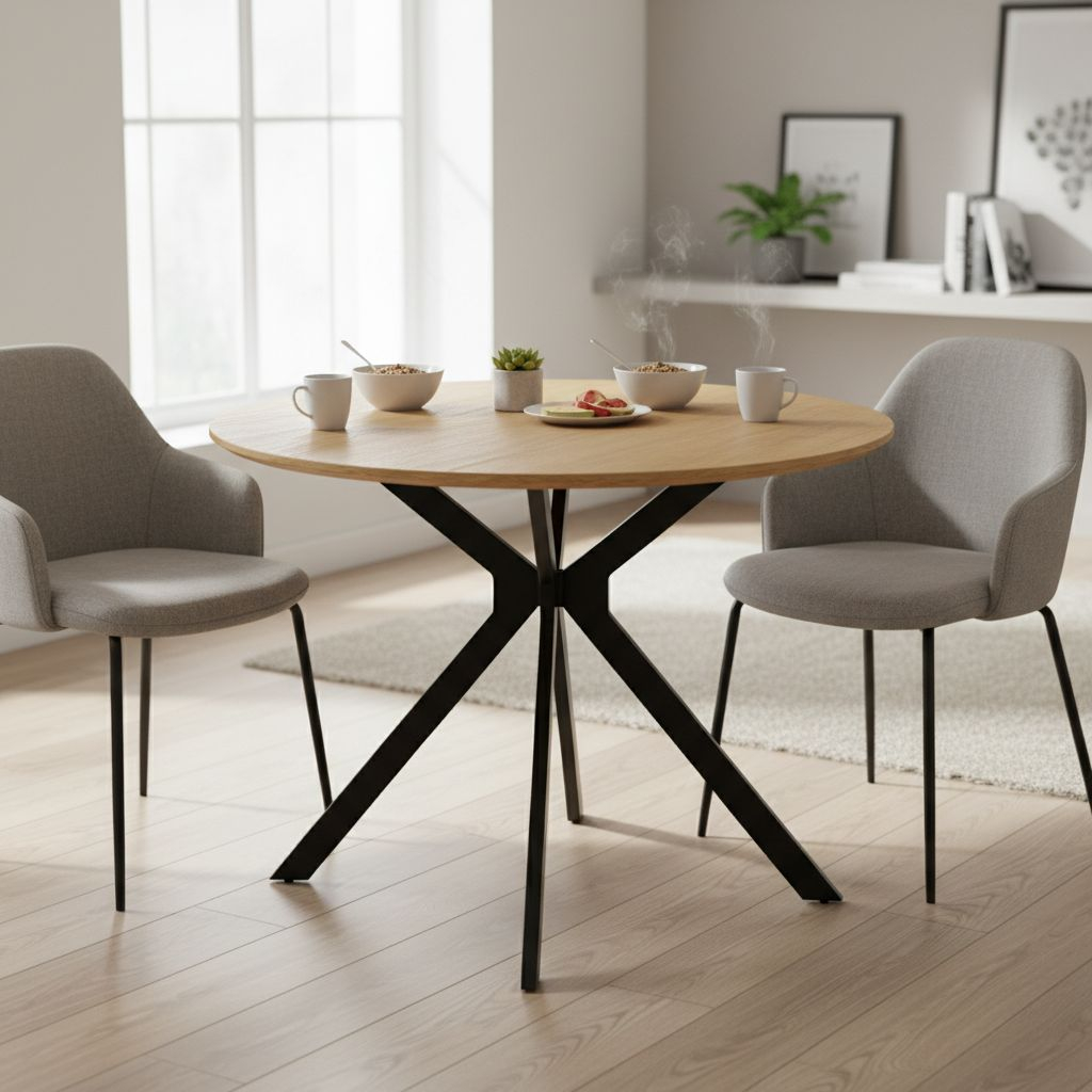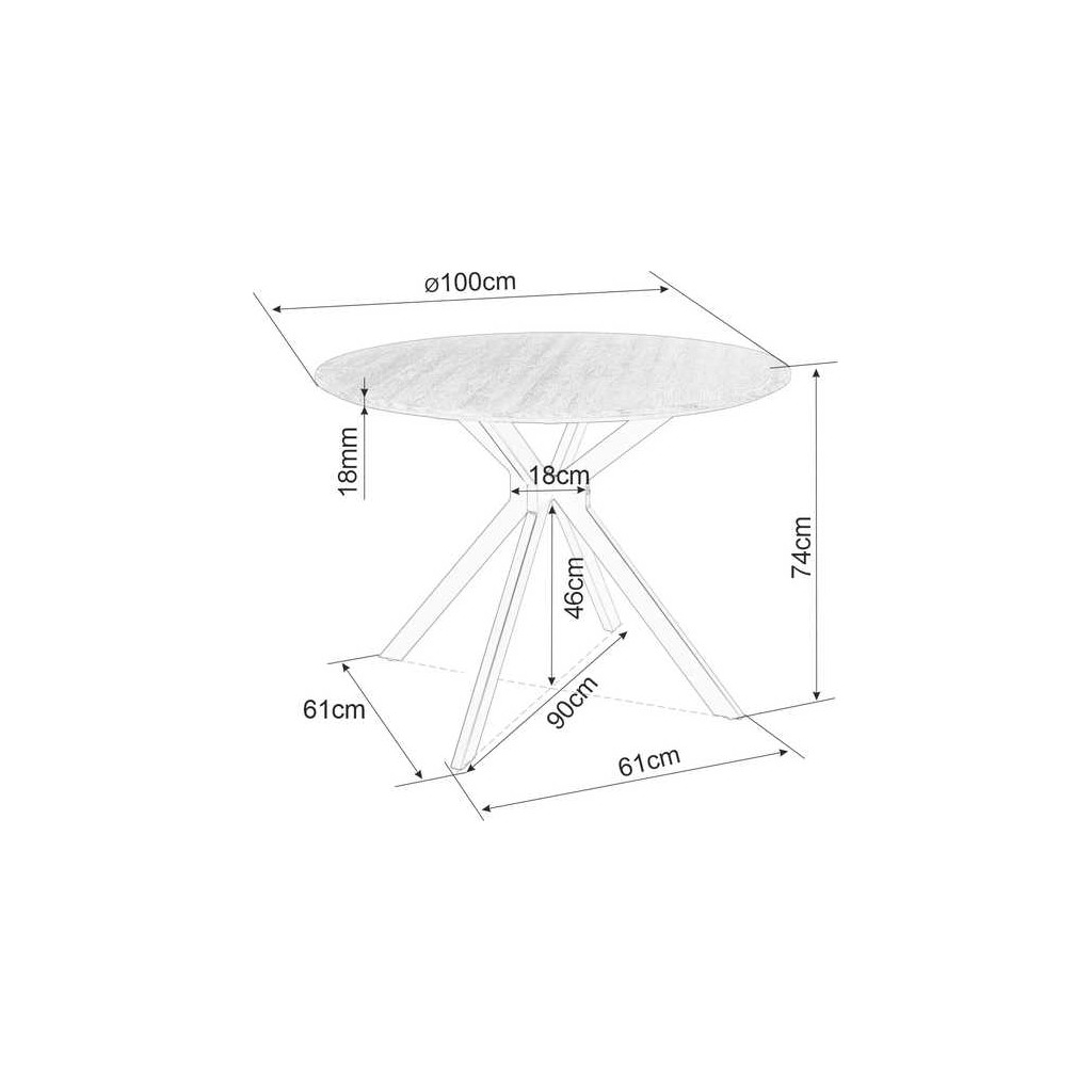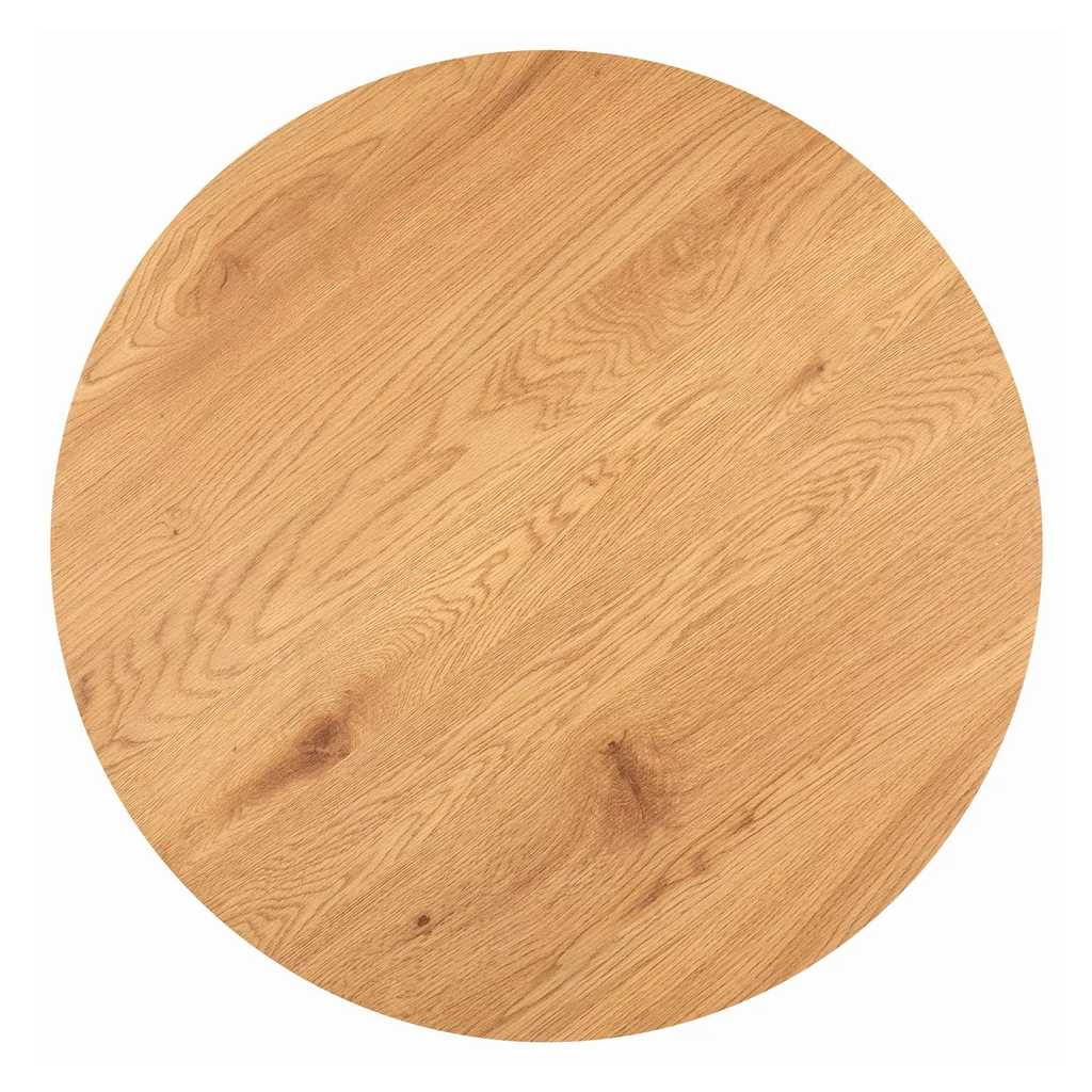 Horní kruhová deska je vyrobená z kombinace dřevovlákna a dýhy o tloušťce 1,8 cm. Zaručuje tak stabilitu a pevnost při každodenních úkonech. Tomuto dopomáhají také kovové nohy uspořádané neobvyklým způsobem. Vytváří tak prostor 61 cm mezi nohami stolu a zaručuje tak dostatečný prostor pro vaše nohy.