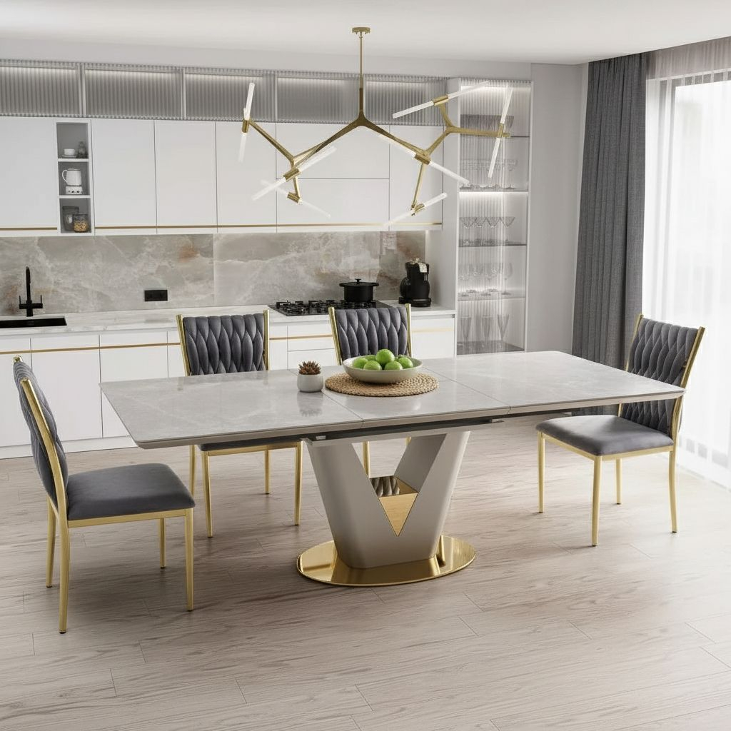 Deska stolu je vyrobená z lakovaného MDF a keramiky, vizuálně úchvatný povrch vytváří dekor šedého mramoru. Stabilitu a honosnost stolu dodává jeho podnož z chromované oceli. Podnož je designovým prvkem a zároveň zajišťuje, že stůl je pevně ukotvený na podlaze. Celá konstrukce stolu je navržená tak, aby si hravě poradila s 60 kg nálože dobrot.