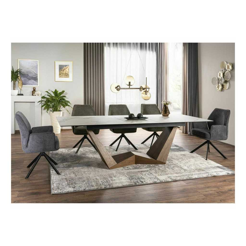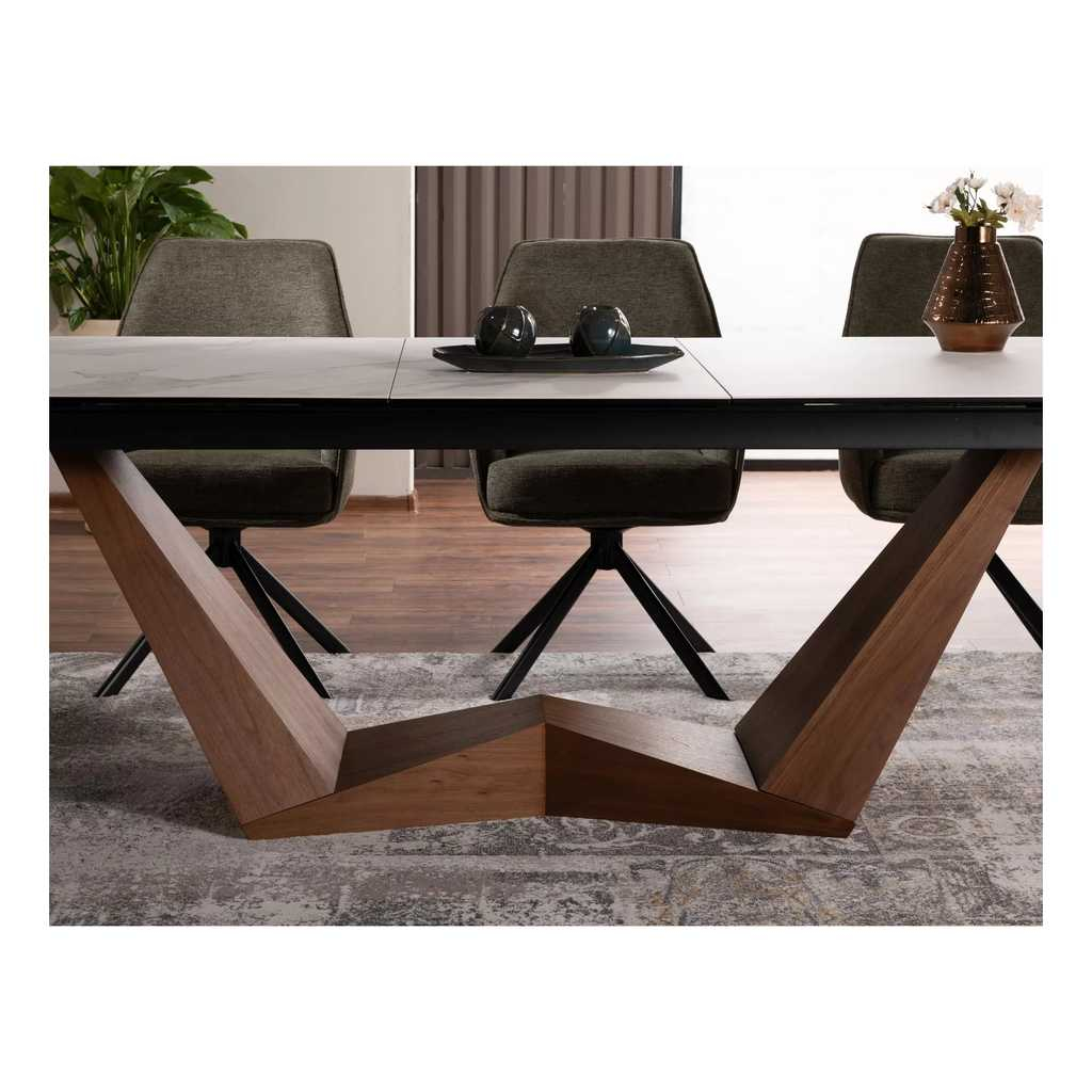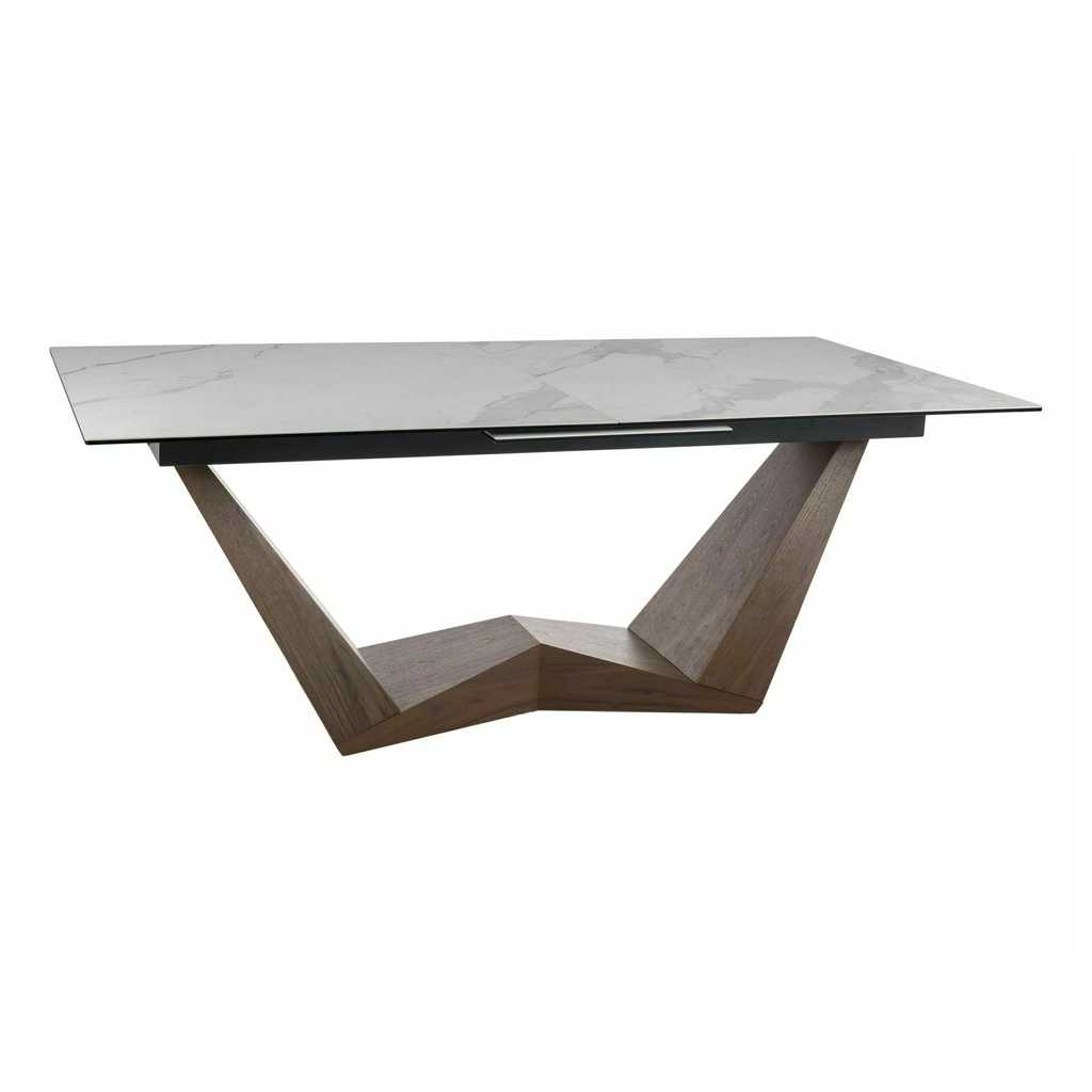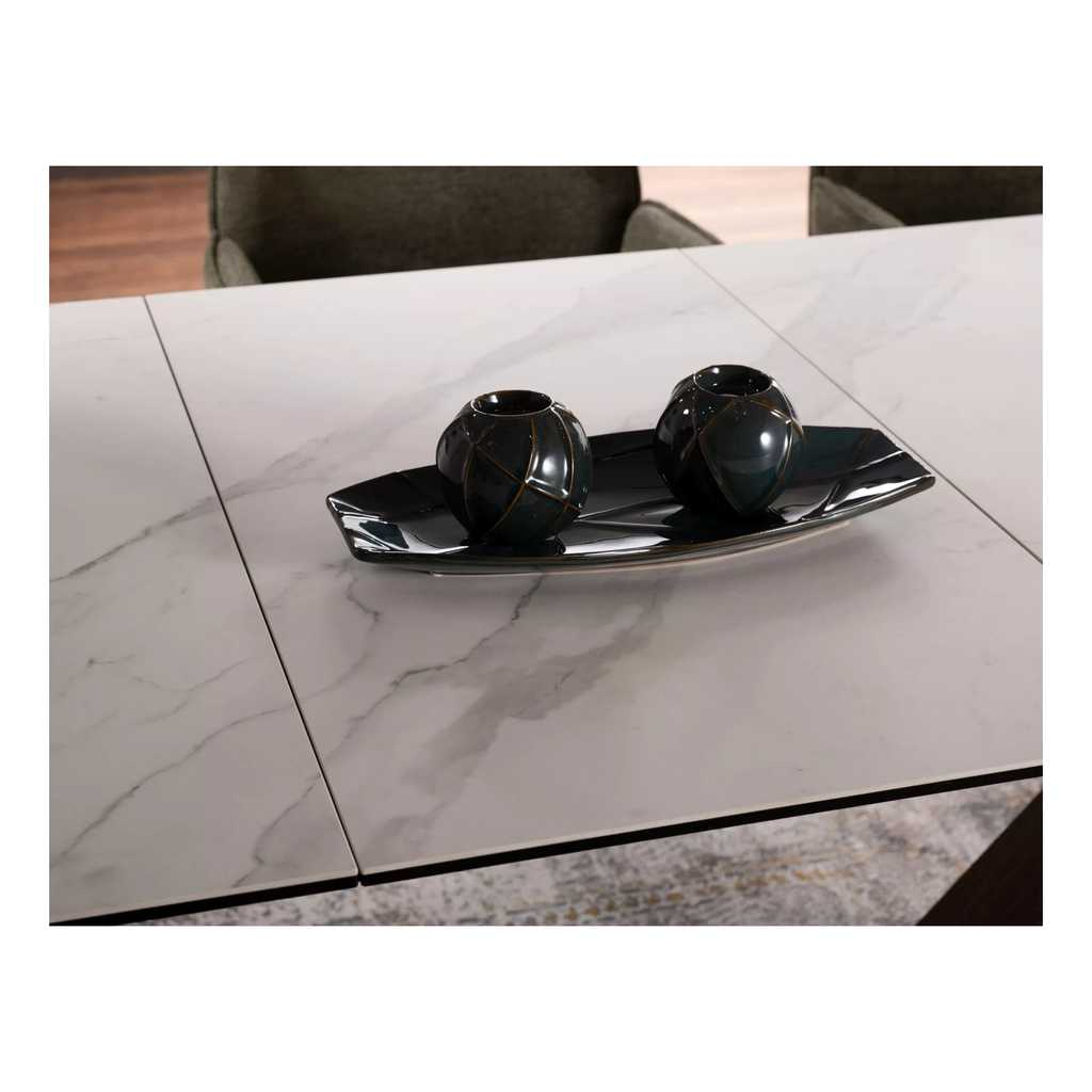 Deska stolu je vyrobená z tvrzeného skla a italské keramiky. Tyto materiály se spojují, aby vytvořily mimořádně odolný, ale i vizuálně úchvatný povrch. Efekt přepychu umocňuje unikátní dekor desky.