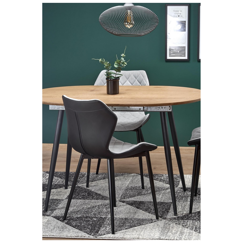 Horní deska stolu v dezénu dubu zlatého je vyrobená z dýhované MDF a je možné ji rozložit do délky 160 cm. Lakovaná ocelová podnož stolu nabízí dokonalou pevnost a stabilitu stolu.