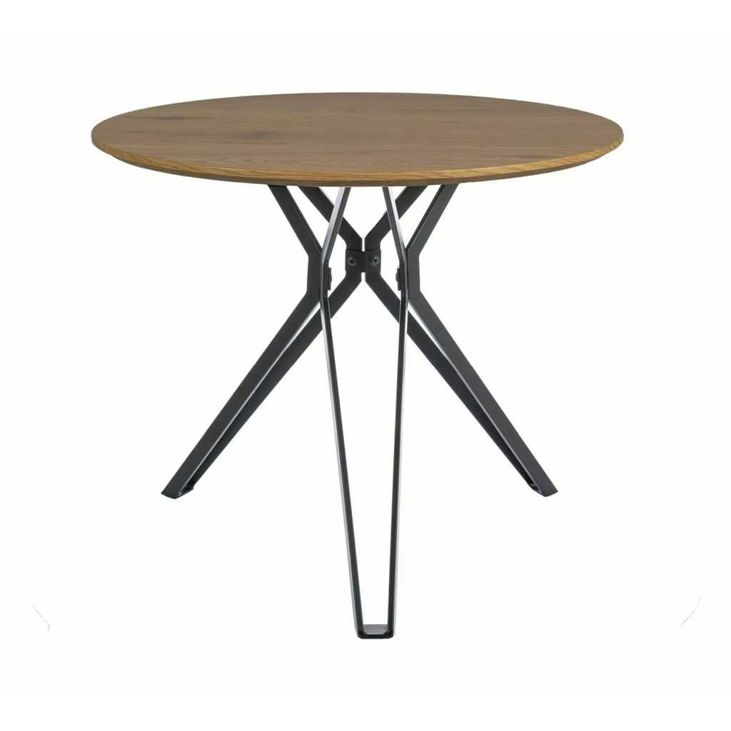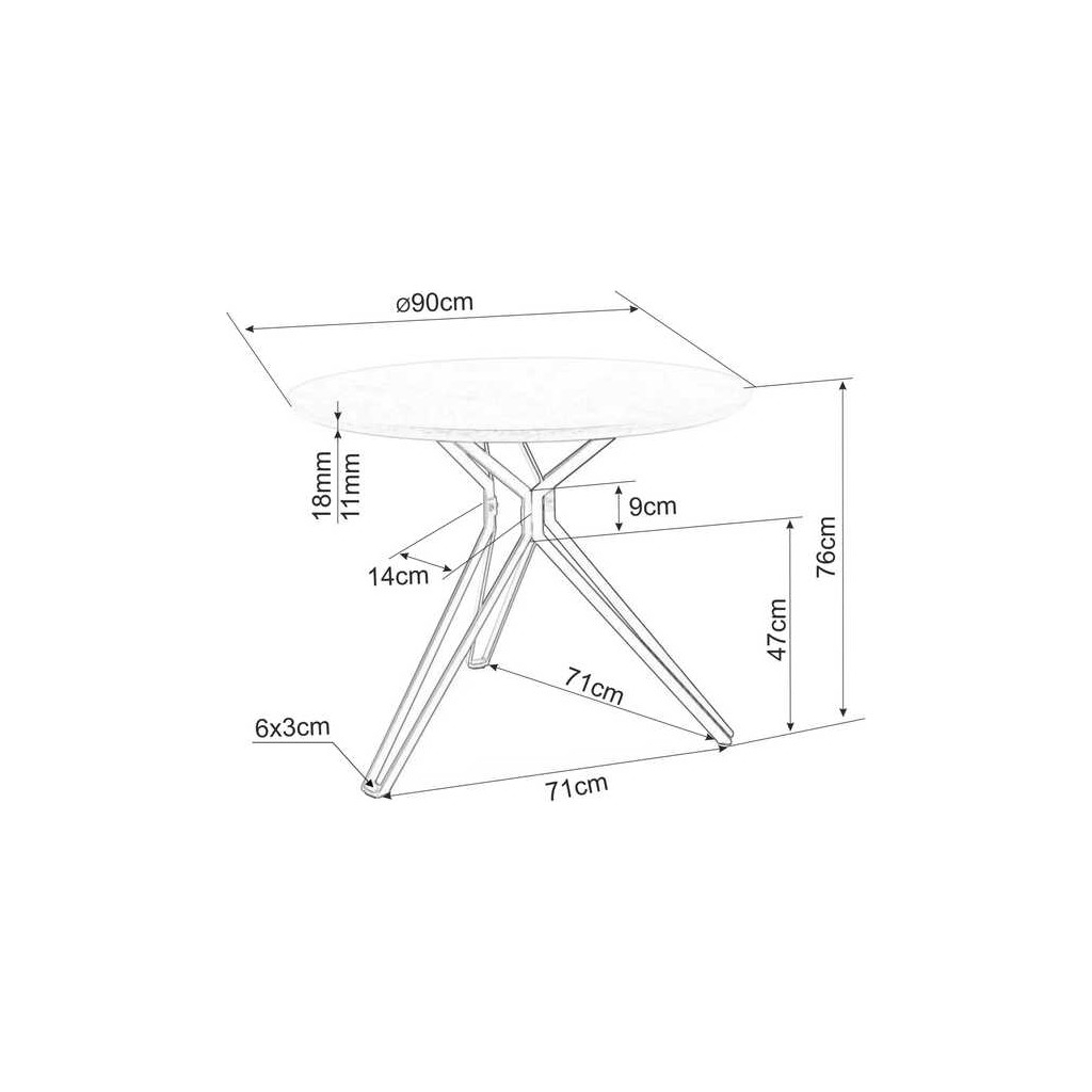 Horní desku tvoří kruh z dýhovaného dřevovlákna (MDF) o síle 18 mm a průměru 90 cm. Ve výšce 76 cm ji drží stabilní podnož z práškované ocele, která je zároveň hlavním designovým prvkem stolu – tvoří ji 3 štíhlé nohy se zúžením ve výšce sedu. To jednak ozvláštňuje vzhled stolu, jednak vám to usnadní zasunutí židlí.