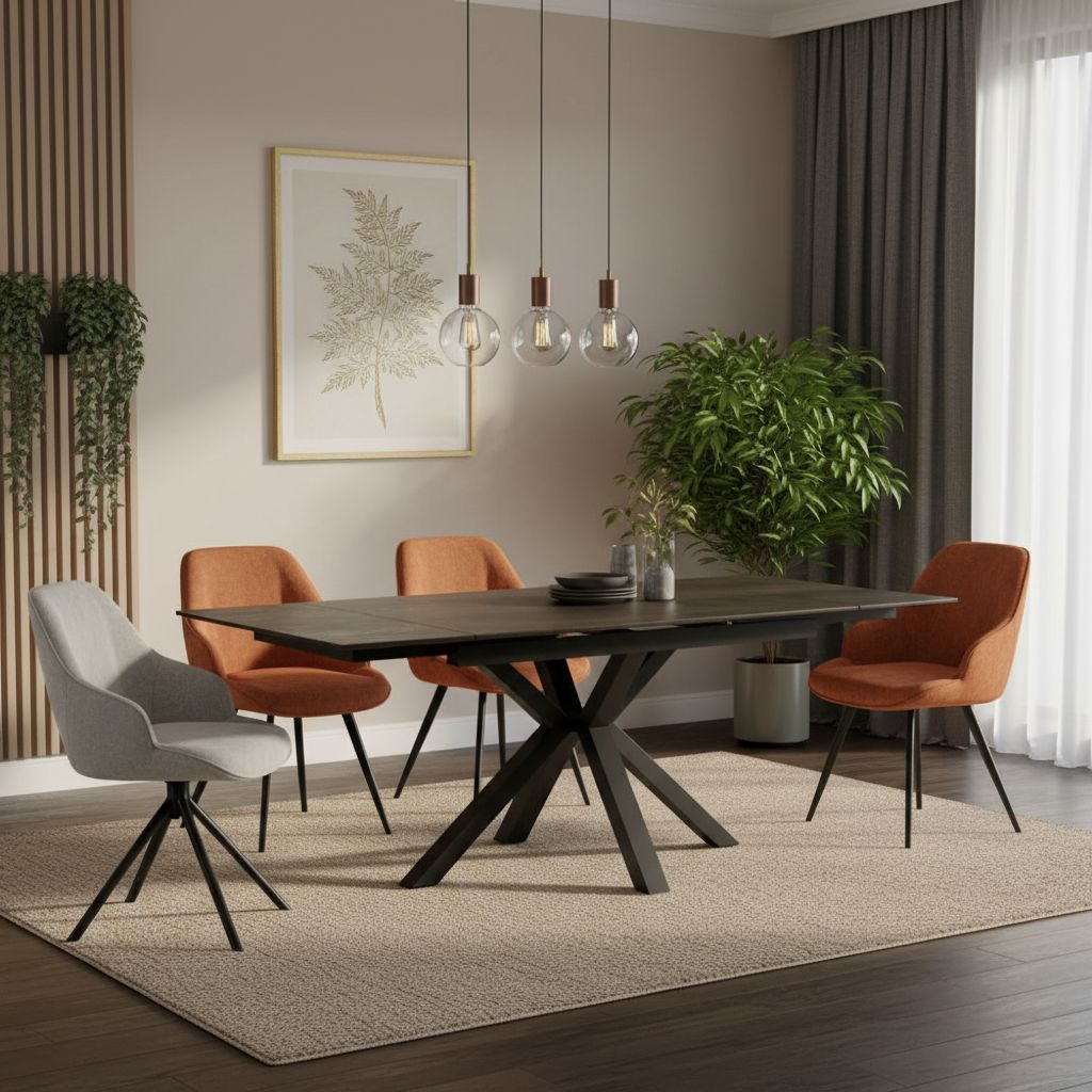 Deska stolu je vyrobená z tvrzeného skla a španělské keramiky. Tyto materiály se spojují, aby vytvořily mimořádně odolný, ale i vizuálně úchvatný povrch. Domáckou atmosféru interiéru vytvoří dekor dřeva.