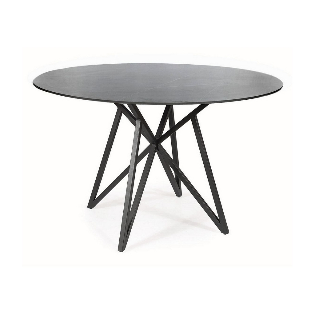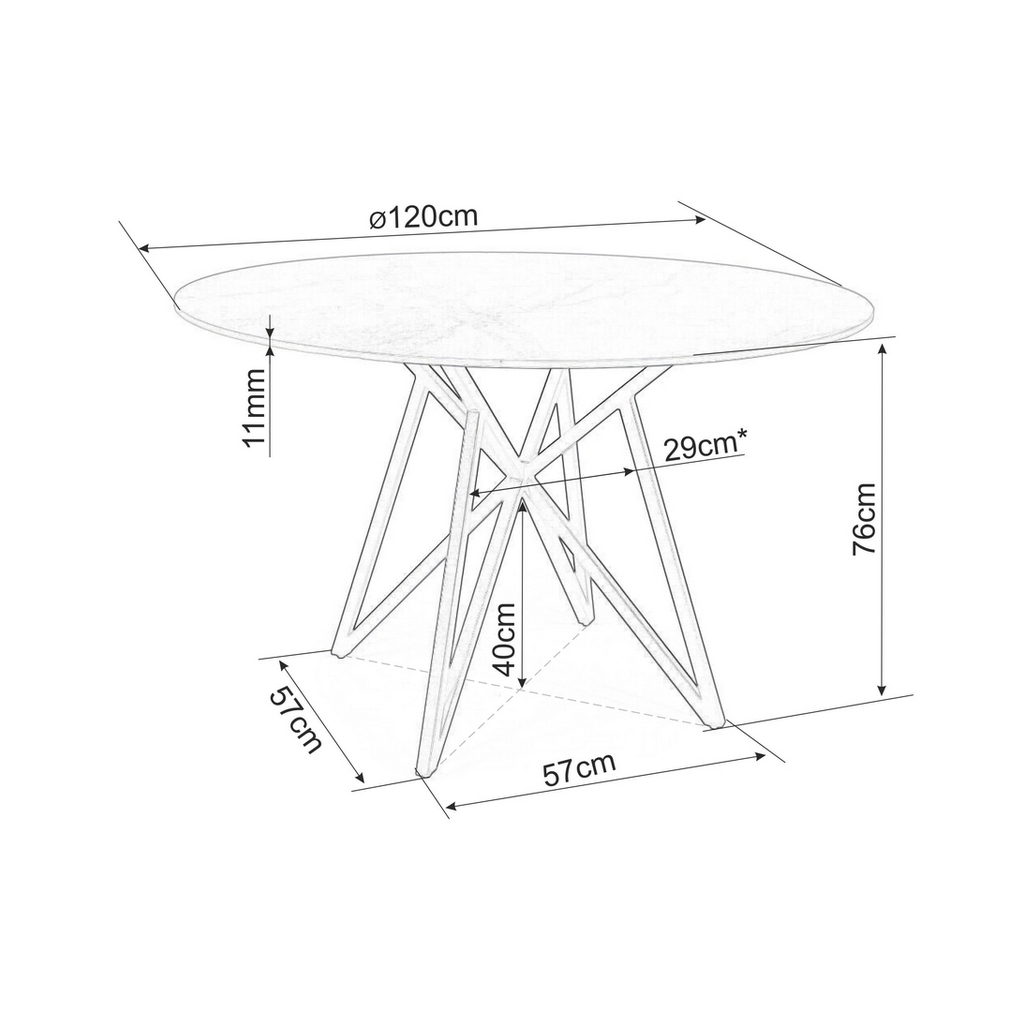 Jeho kulatá deska z keramiky o průměru 120 cm vás oslní sofistikovaným efektem mramoru. Desku stolu podpírá nevšedně řešená podnož. Tu tvoří křížící se kovové tyče. Celek je dokonalou kombinací elegance a odolnosti.