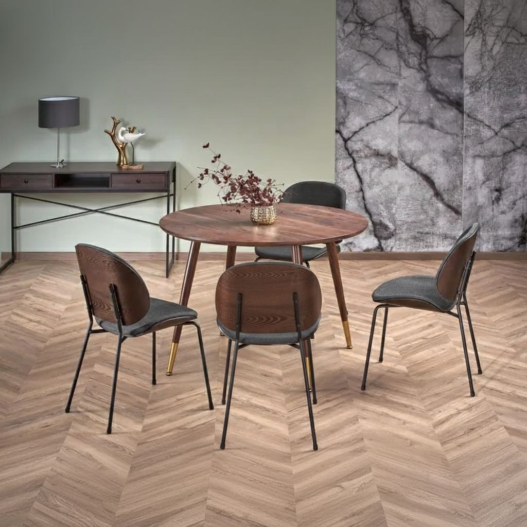 Kulatá horní deska je vyrobená z dýhovaných MDF desek, nohy stolu pak částečně ze stejného materiálu. Jejich ozdobné zlaté zakončení je z lakované oceli. Podlahu před poničením chrání kluzáky na každé z noh.