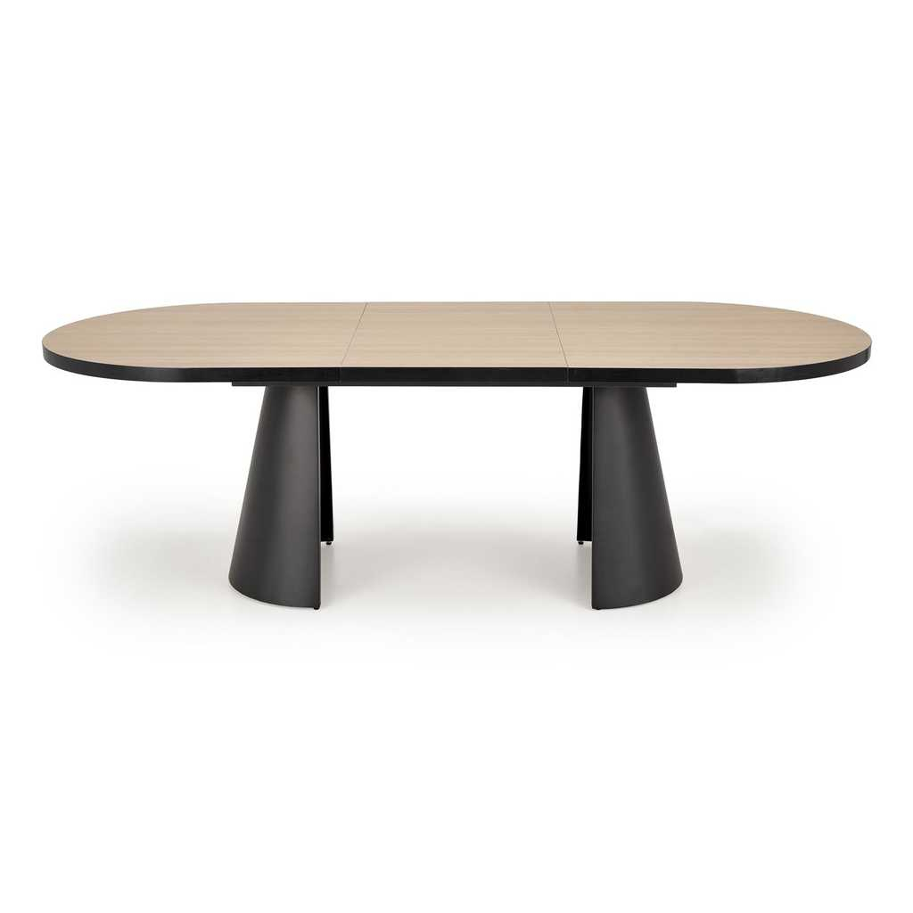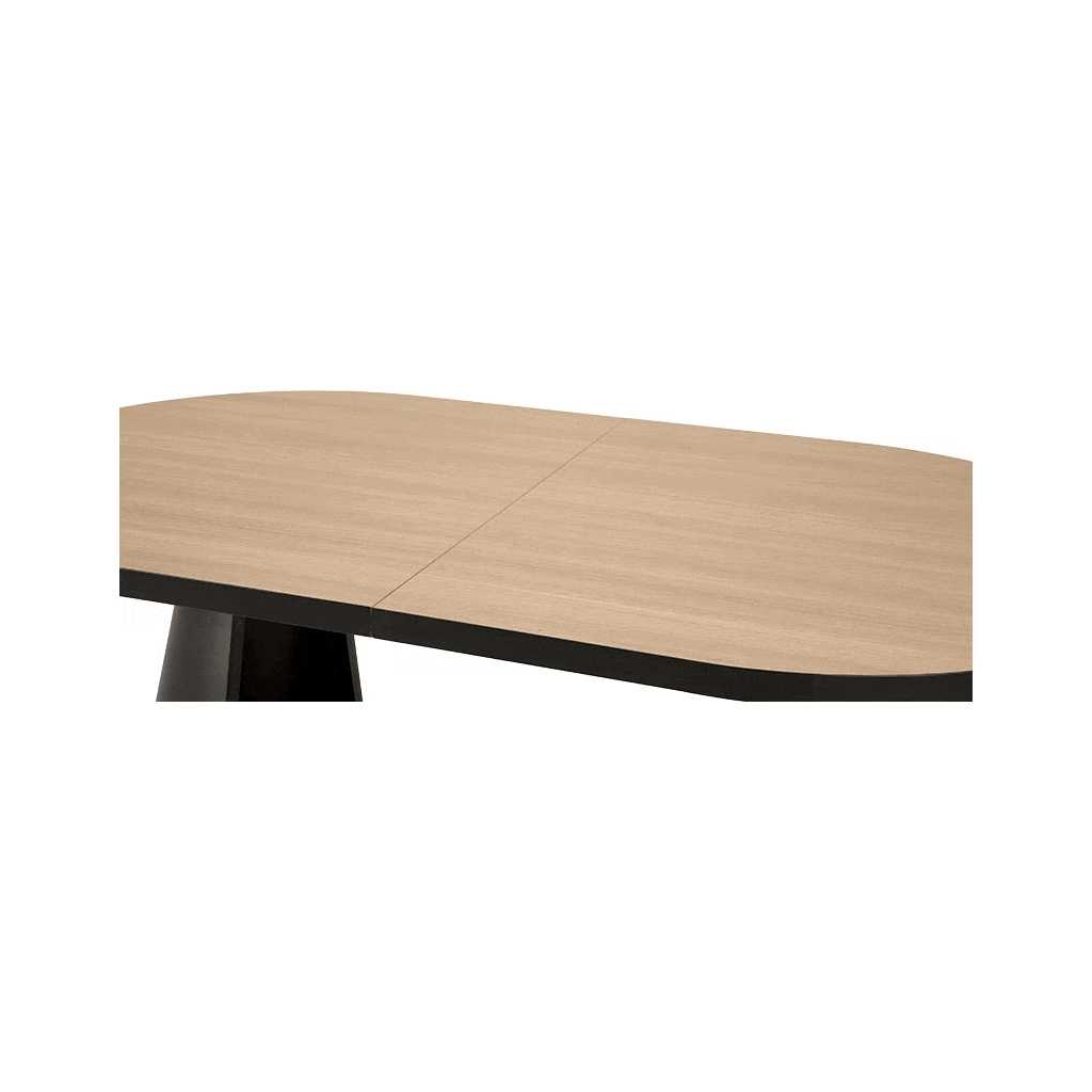 Podstavec stolu tvoří výrazné, pevné nohy z práškované oceli. Tyto nohy mají zajímavý a robustní tvar, který dodává stolu nejen stabilitu, ale i unikátní vizuální charakter. Černá ocelová konstrukce skvěle kontrastuje se světlou deskou, čímž vytváří sofistikovaný a zároveň moderní vzhled.