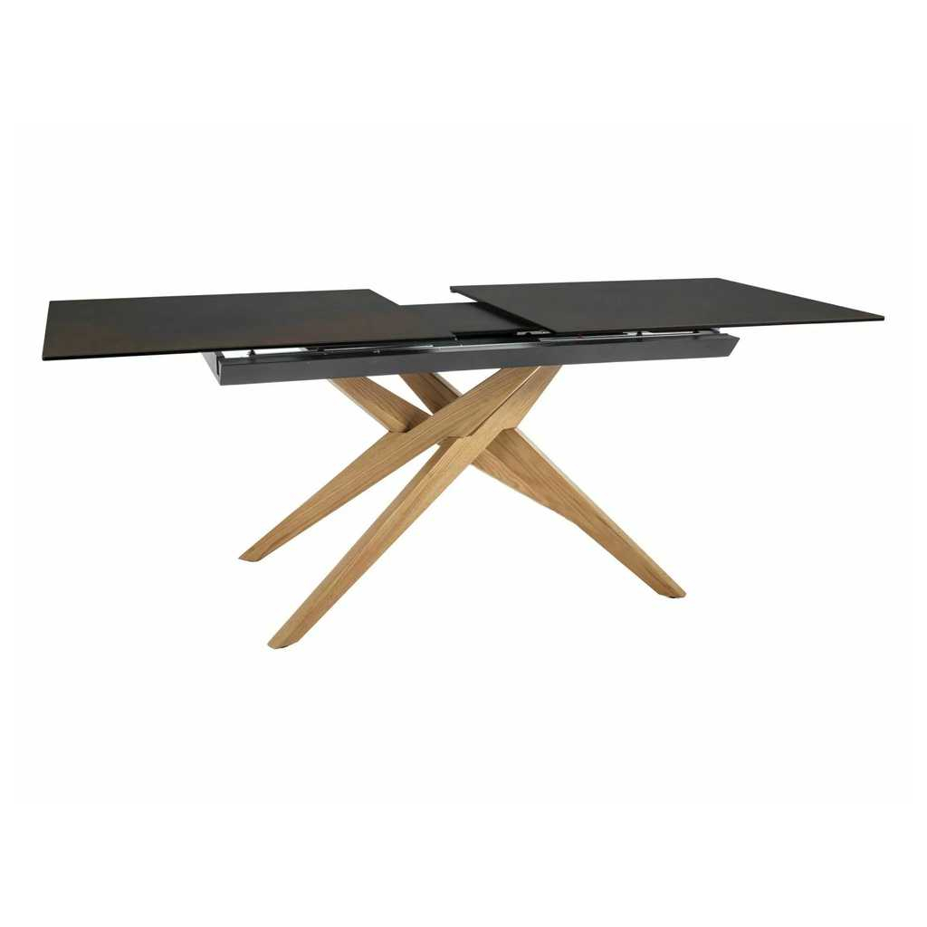 Horní deska stolu je z kombinace matného tvrzeného skla a keramiky o síle 11 mm. Před rozložením má délku 180 cm a hloubku 90 cm – ideální pro 6 osob.