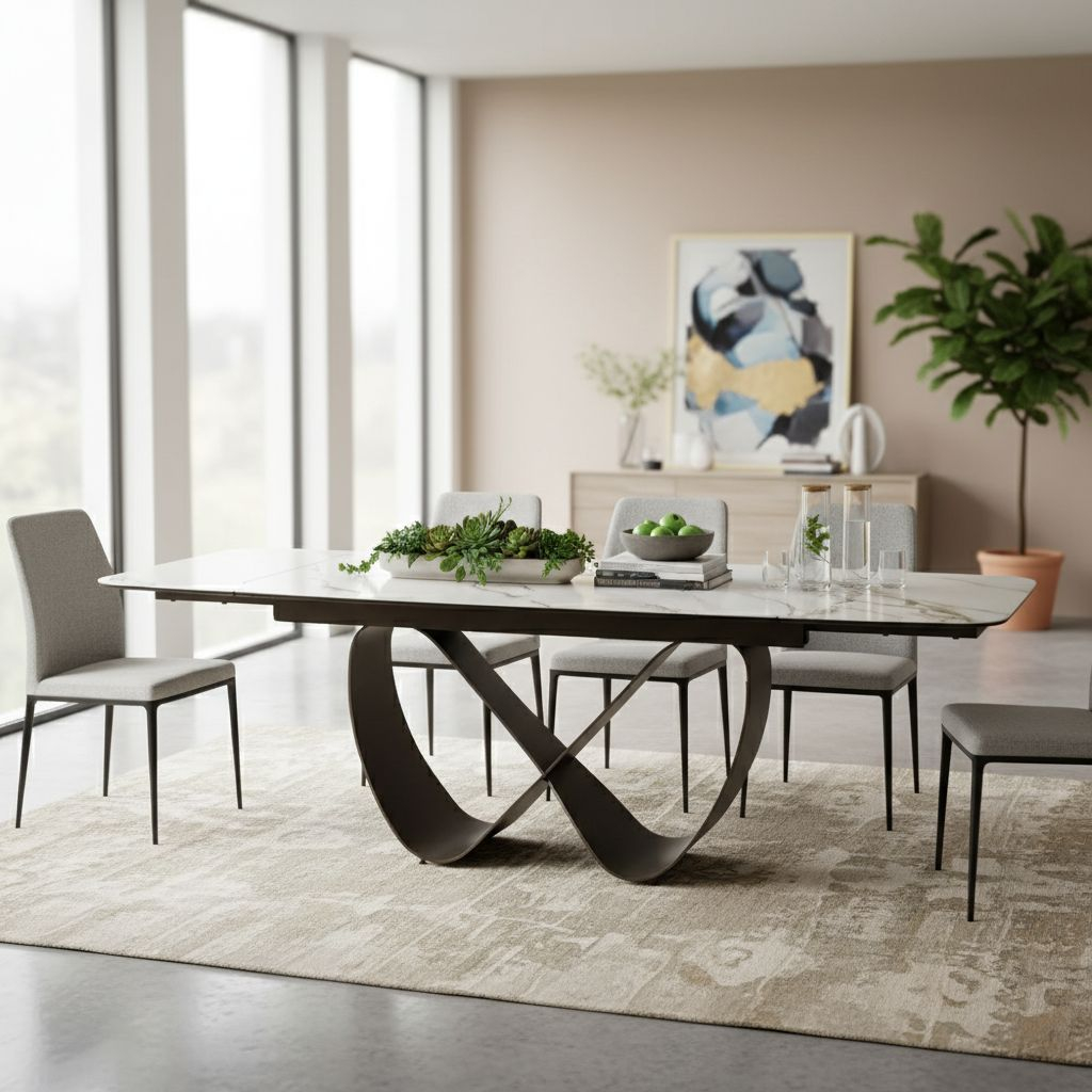 Deska stolu je vyrobená z tvrzeného skla a španělské keramiky. Tyto materiály se spojují, aby vytvořily mimořádně odolný, ale i vizuálně úchvatný povrch. Efekt přepychu umocňuje dekor mramoru.
