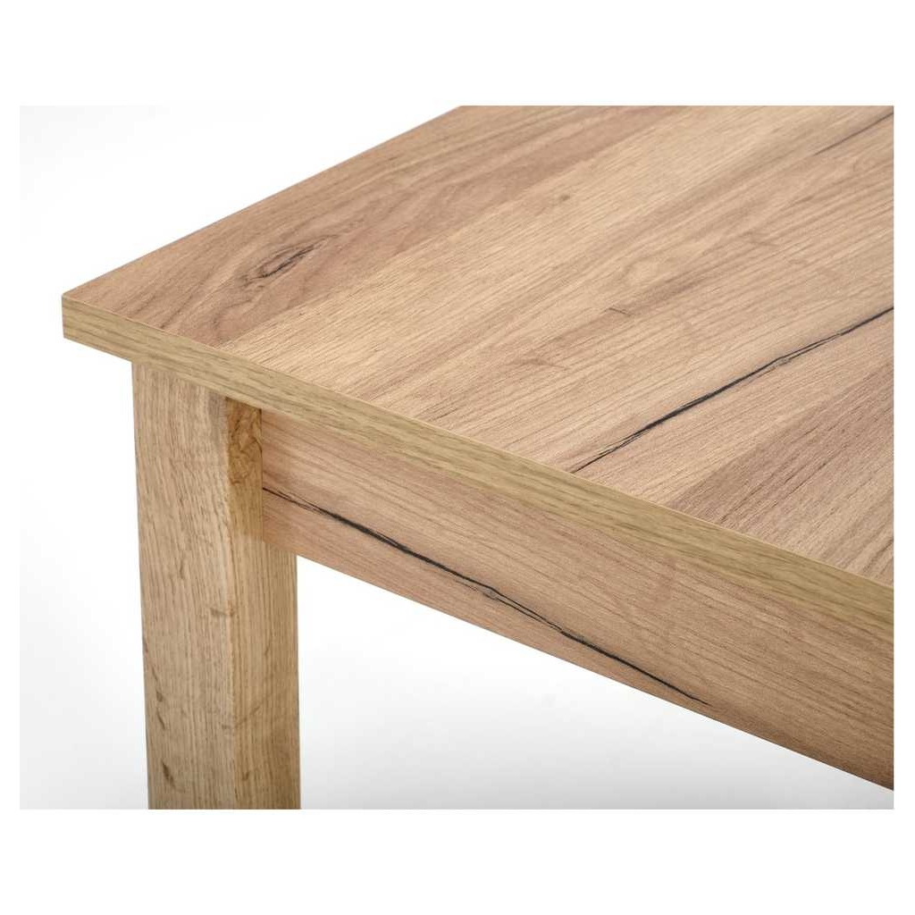 Horní deska i nohy stolu jsou vyrobené z dřevovláknitých desek. Výhodou tohoto materiálu je především odolnost, nenákladnost a snadná údržba. Čistý stůl si udržíte pár tahy vlhkým hadříkem.