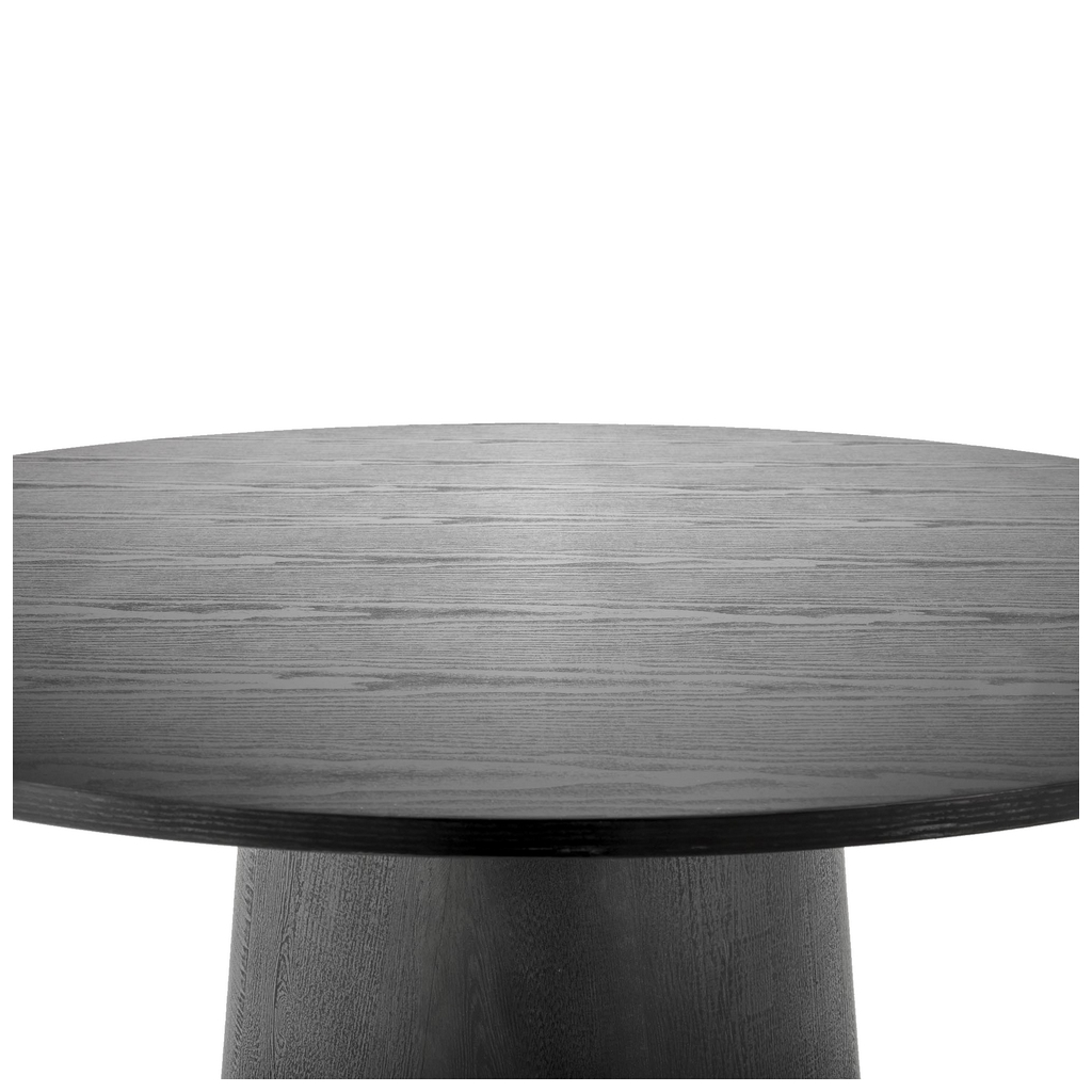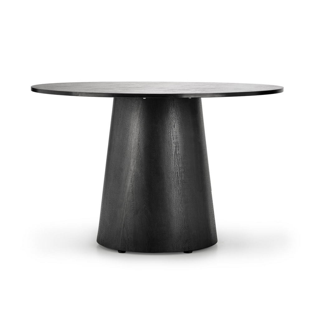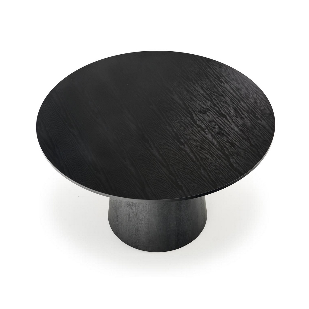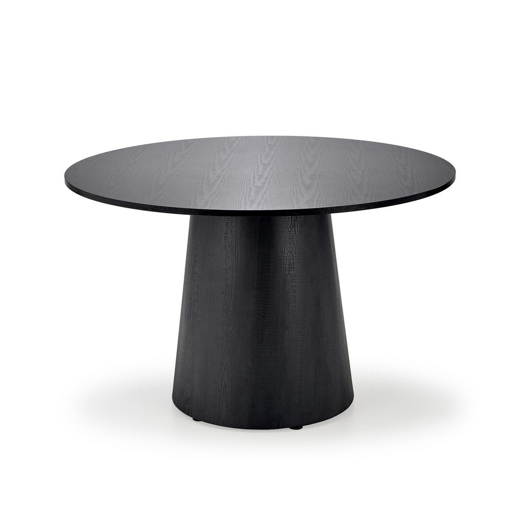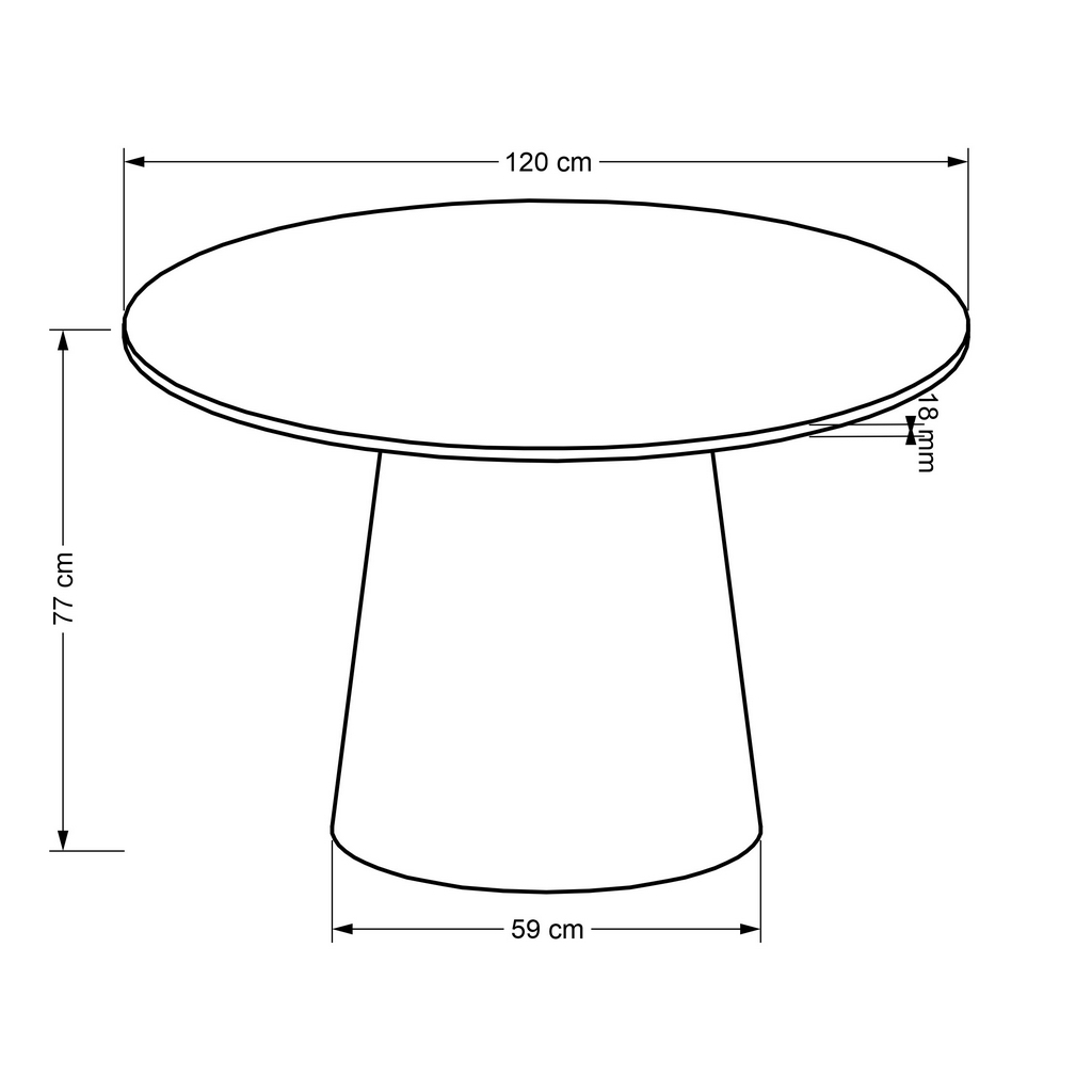 Stůl se skládá z 18 mm silné kruhové desky o průměru 120 cm a kuželovité středové nohy. Podstava má průměr 59 cm, což stolu propůjčuje skvělou stabilitu, aniž by vám podnož překážela při sezení.
