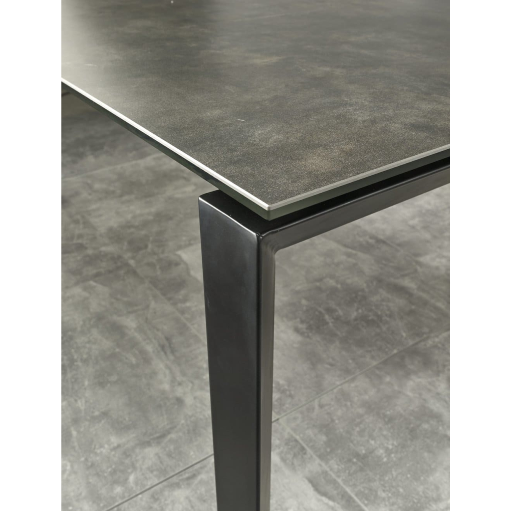 Stůl je specifický především svou kouřově šedou barvou a jeho největší předností je obdélníková deska, která je vyrobena z keramiky. Je tak velmi příjemná na dotek a snadno se udržuje. Desku drží pevné nohy vyrobené z práškované oceli, které dodávájí stabilitu celému stolu.