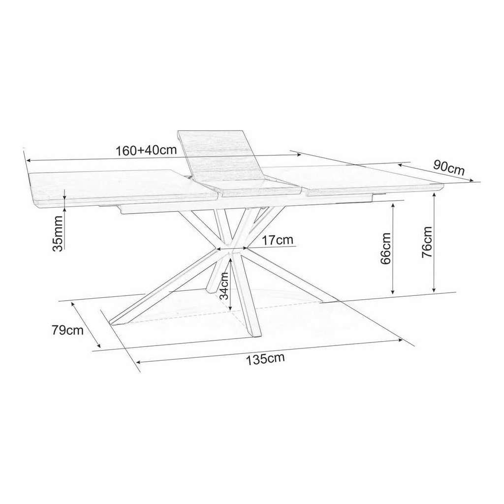 Horní deska stolu je z dýhovaného dřevovlákna (MDF) o síle 35 mm. Před rozložením má délku 160 cm a hloubku 90 cm – bohatě vystačí pro 4 osoby.