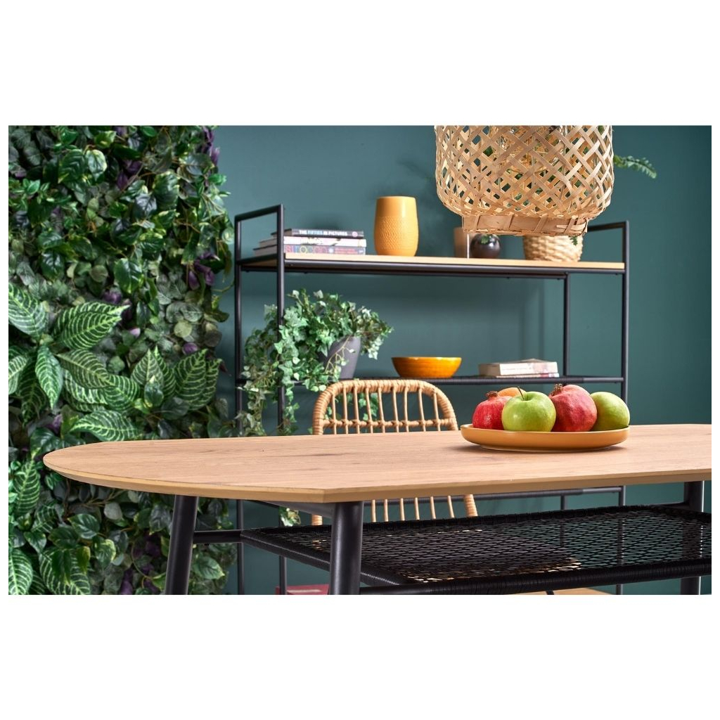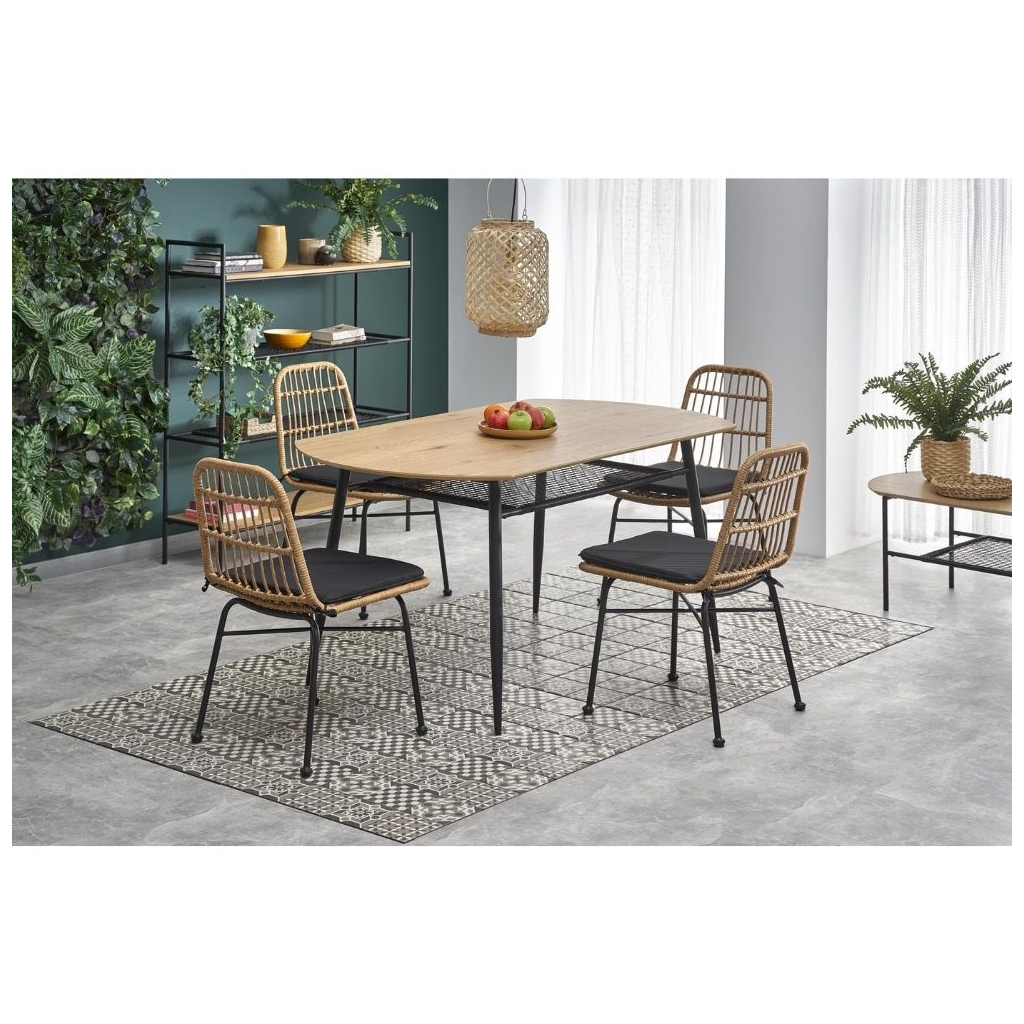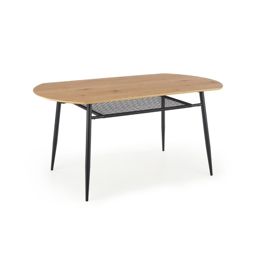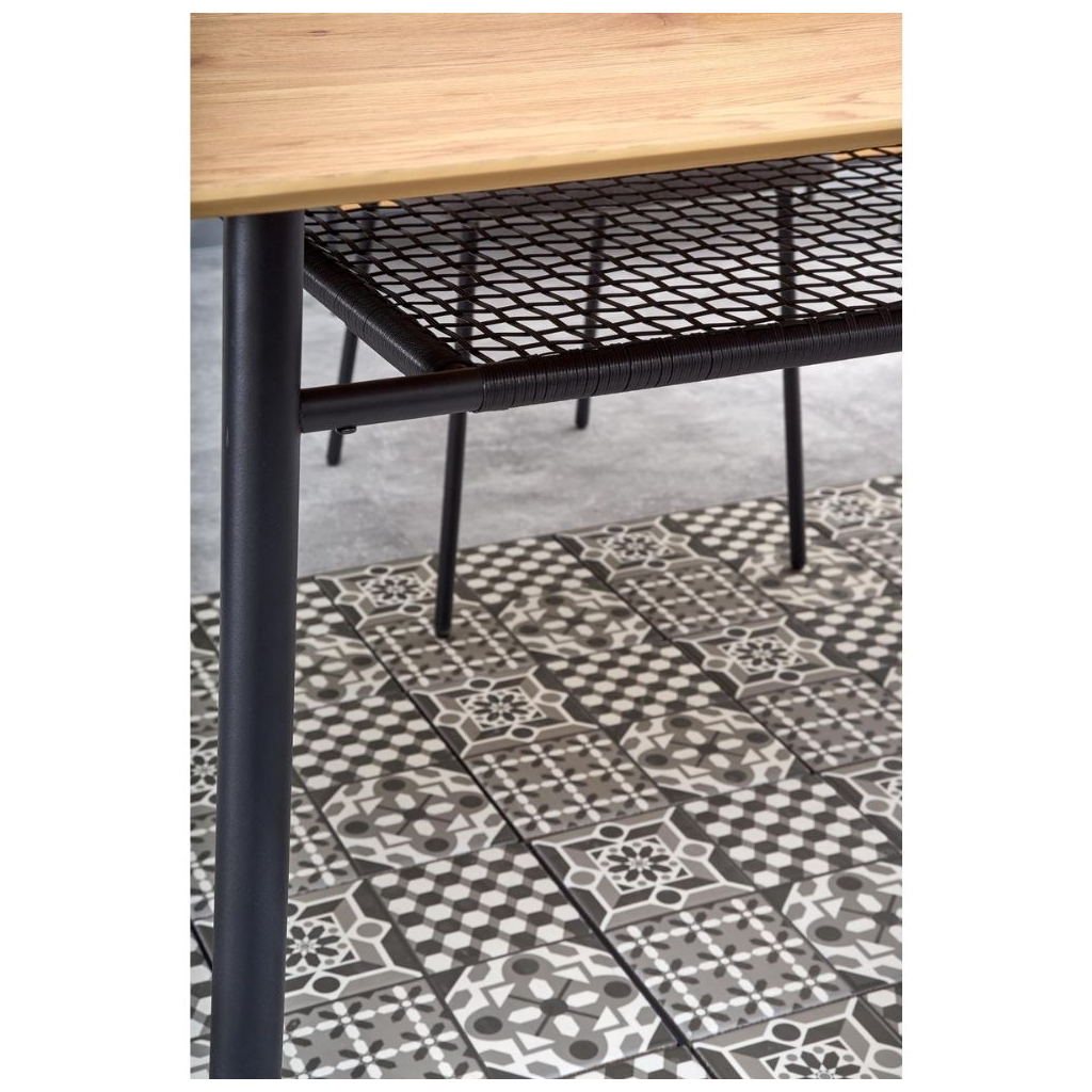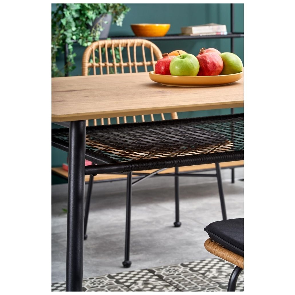 Tento na pohled jednoduchý jídelní stůl nabízí dostatek prostoru pro usazení 4 osob a současně praktickou odkládací polici z umělého ratanu pod jídelní deskou. Stůl je vyroben z dýhované MDF desky v dekoru zlatý dub v kombinaci s ocelovými nožkami v černé barvě.