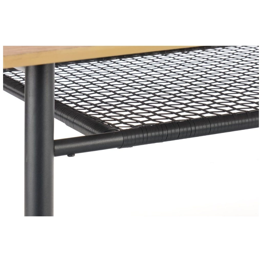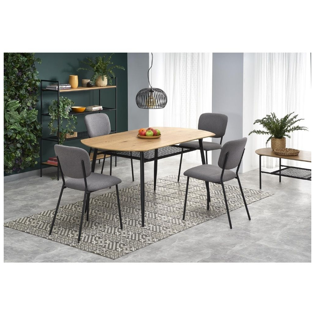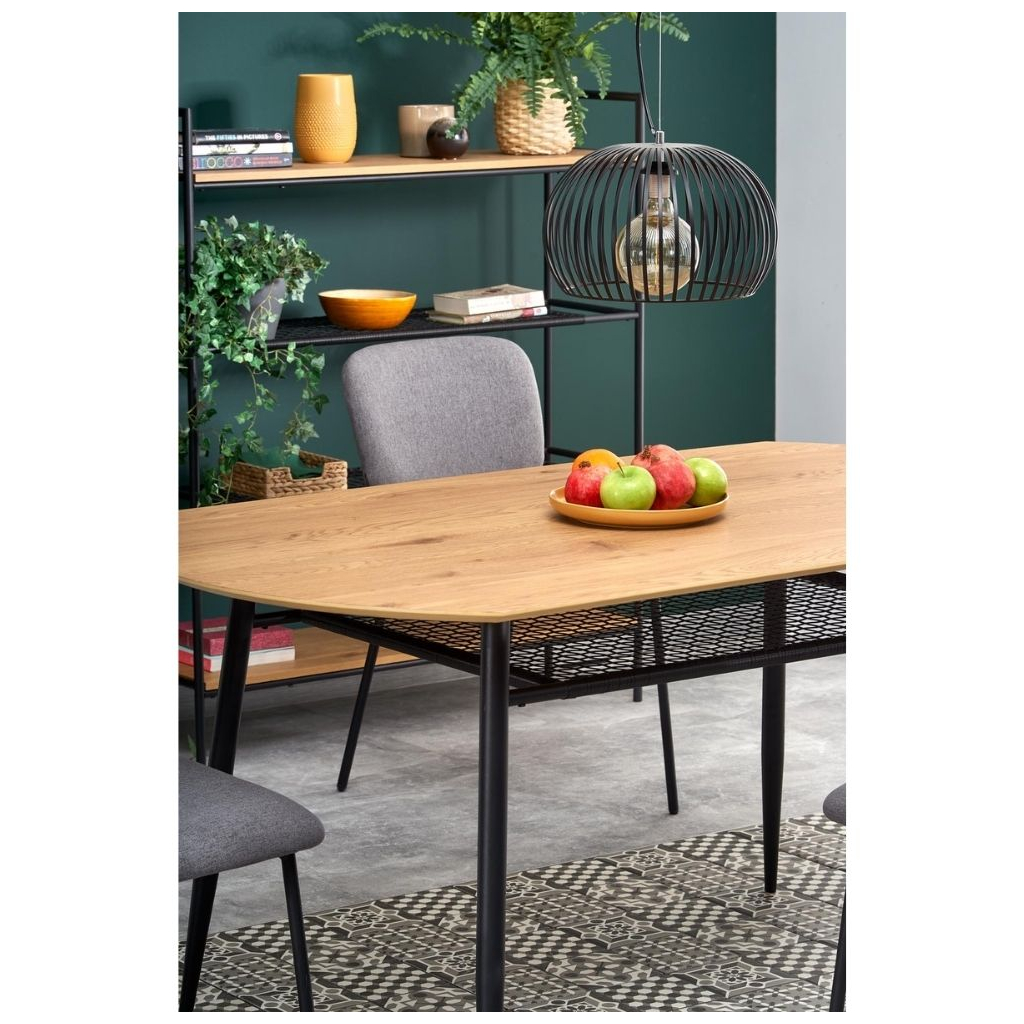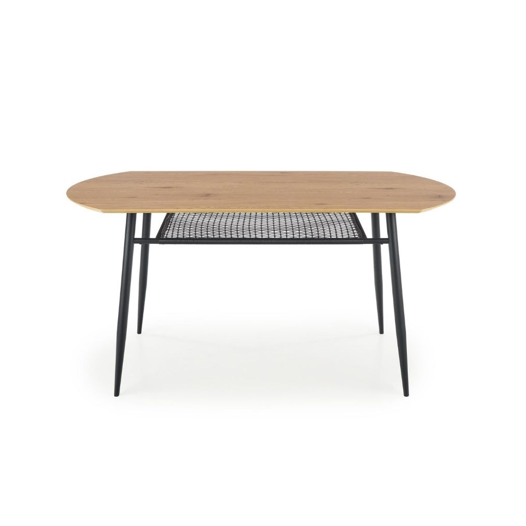 Tento na pohled jednoduchý jídelní stůl nabízí dostatek prostoru pro usazení 4 osob a současně praktickou odkládací polici z umělého ratanu pod jídelní deskou. Stůl je vyroben z dýhované MDF desky v dekoru zlatý dub v kombinaci s ocelovými nožkami v černé barvě.