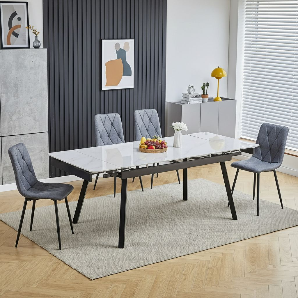 Deska stolu je vyrobená z keramiky. Ta je nejen vizuálně přitažlivá, ale také odolná vůči skvrnám a teplu, což ji činí ideální volbou pro běžné použití. Třešničkou na dortu je dekor mramoru, který dodává tu správnou dávku elegance a přepychovosti, aniž by působil přehnaně.