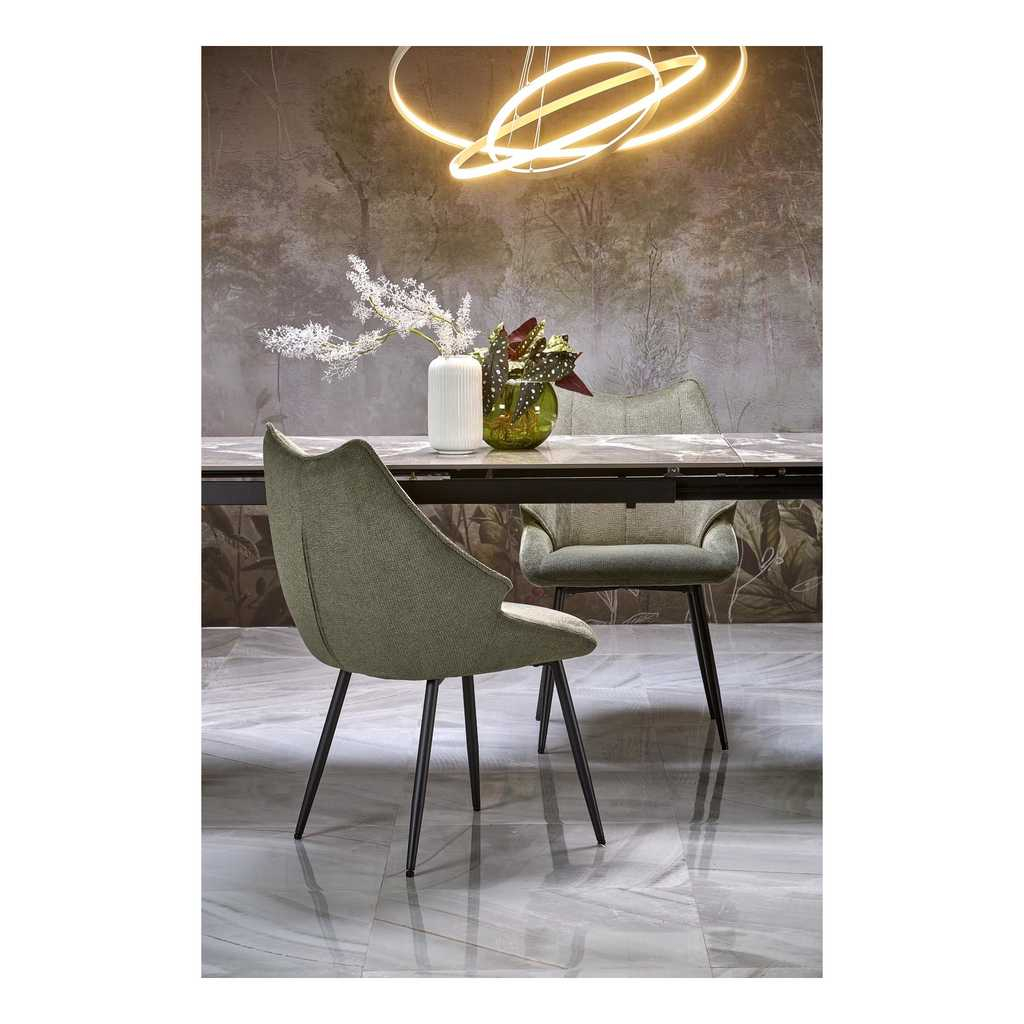 Deska stolu je vyrobená ze sintru, vizuálně úchvatný povrch vytváří dekor mramoru. Stabilitu a eleganci stolu dodává jeho podnož z práškované oceli, tvořená 4 nohami. Podnož i přes svou pevnost působí vzdušně a zároveň zajišťuje, že stůl je dokonale ukotvený na podlaze. Celá konstrukce stolu je navržená tak, aby si hravě poradila s 40 kg nálože dobrot.