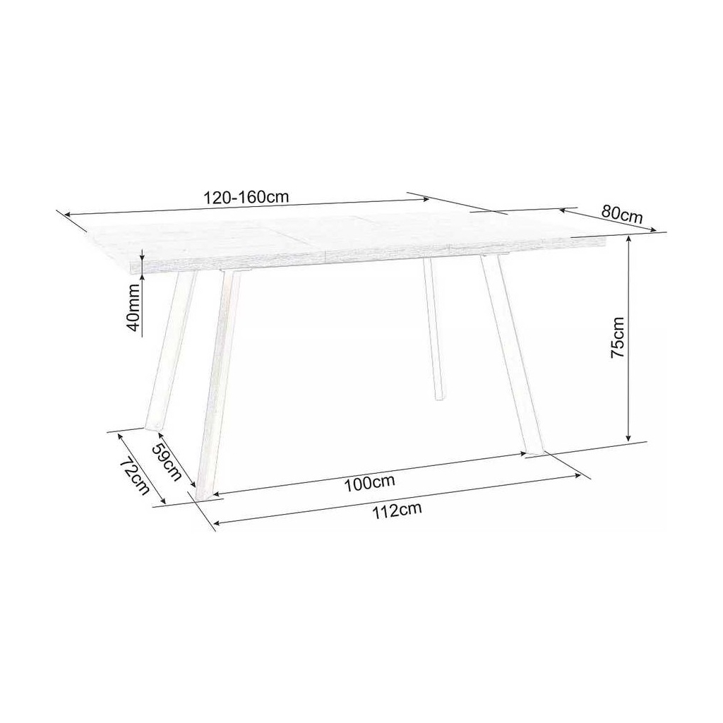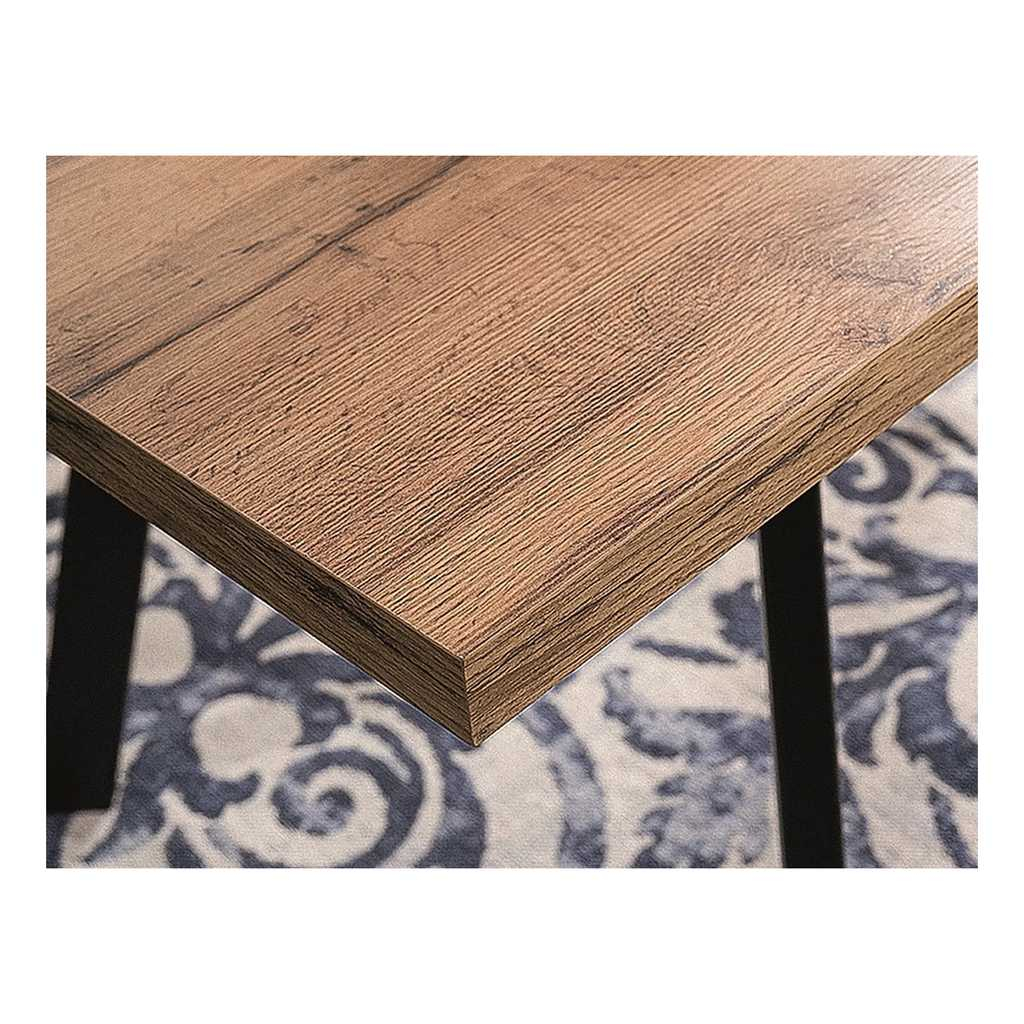 Horní deska stolu je z dýhovaného dřevovlákna (MDF) o síle 40 mm. Před rozložením má délku 120 cm a hloubku 80 cm – bohatě vystačí pro 4 osoby.