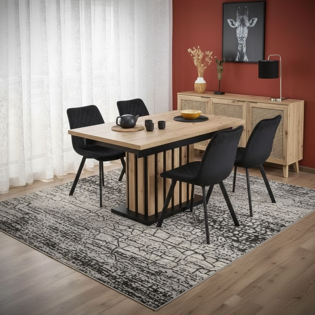 Stůl zaujme především svou centrální podnoží, která nejen že poskytuje stabilitu, ale také vytváří zajímavý designový prvek díky svému strukturovanému vzhledu a kombinaci černých a dřevěných prvků. Tento stylový prvek dodává celkovému vzhledu stolu moderní nádech a zároveň zajišťuje dostatek prostoru pro nohy, takže si všichni hosté mohou pohodlně posedět.