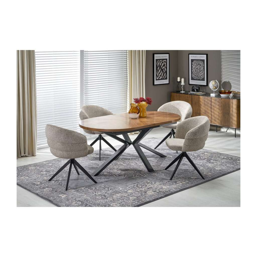 Díky masivní dřevěné desce stůl působí přírodním a přirozeným dojmem, zatímco kovová podnož zaručuje pevnost a odolnost. Oválný tvar stolu navíc přispívá k příjemné atmosféře a jednoduššímu uspořádání židlí kolem stolu.