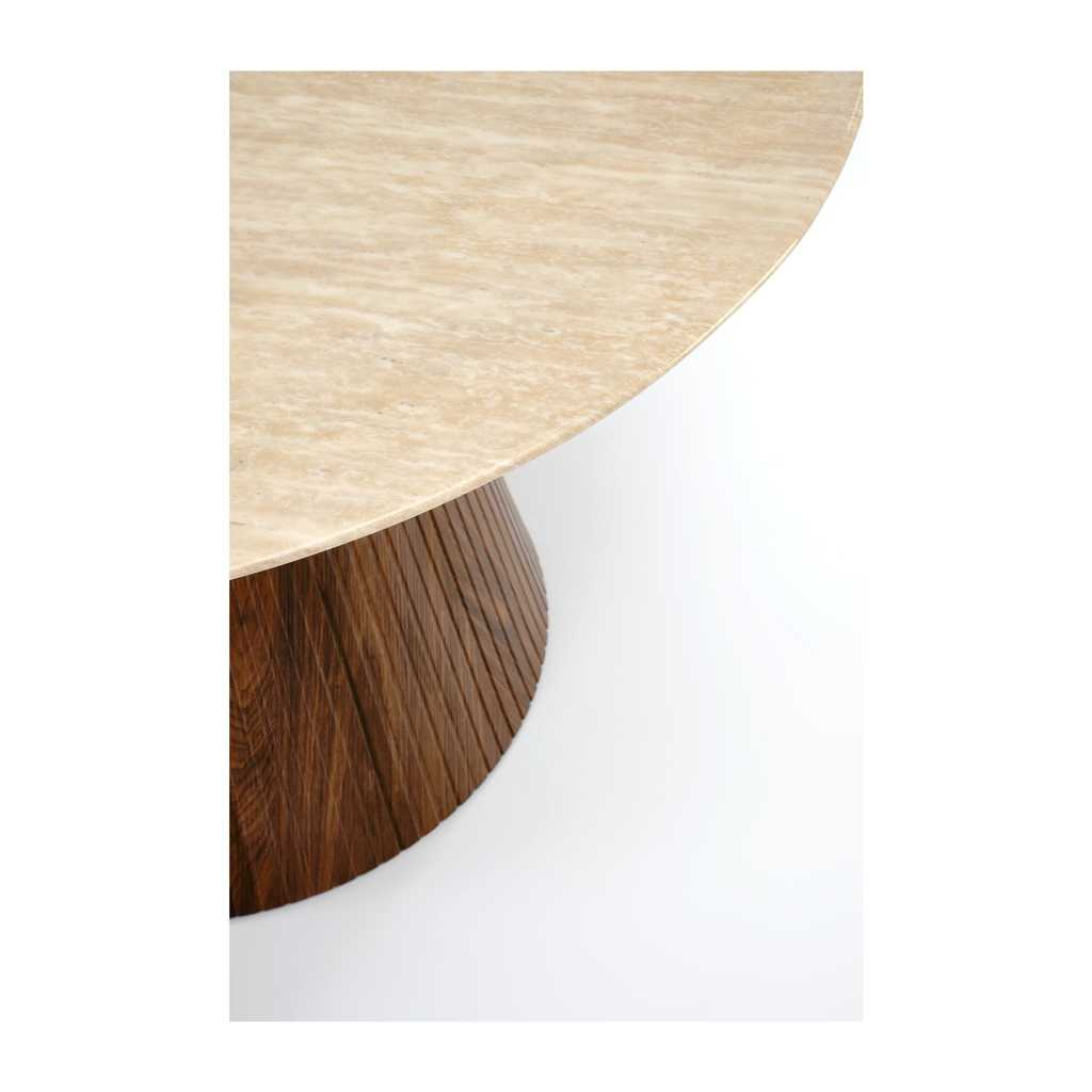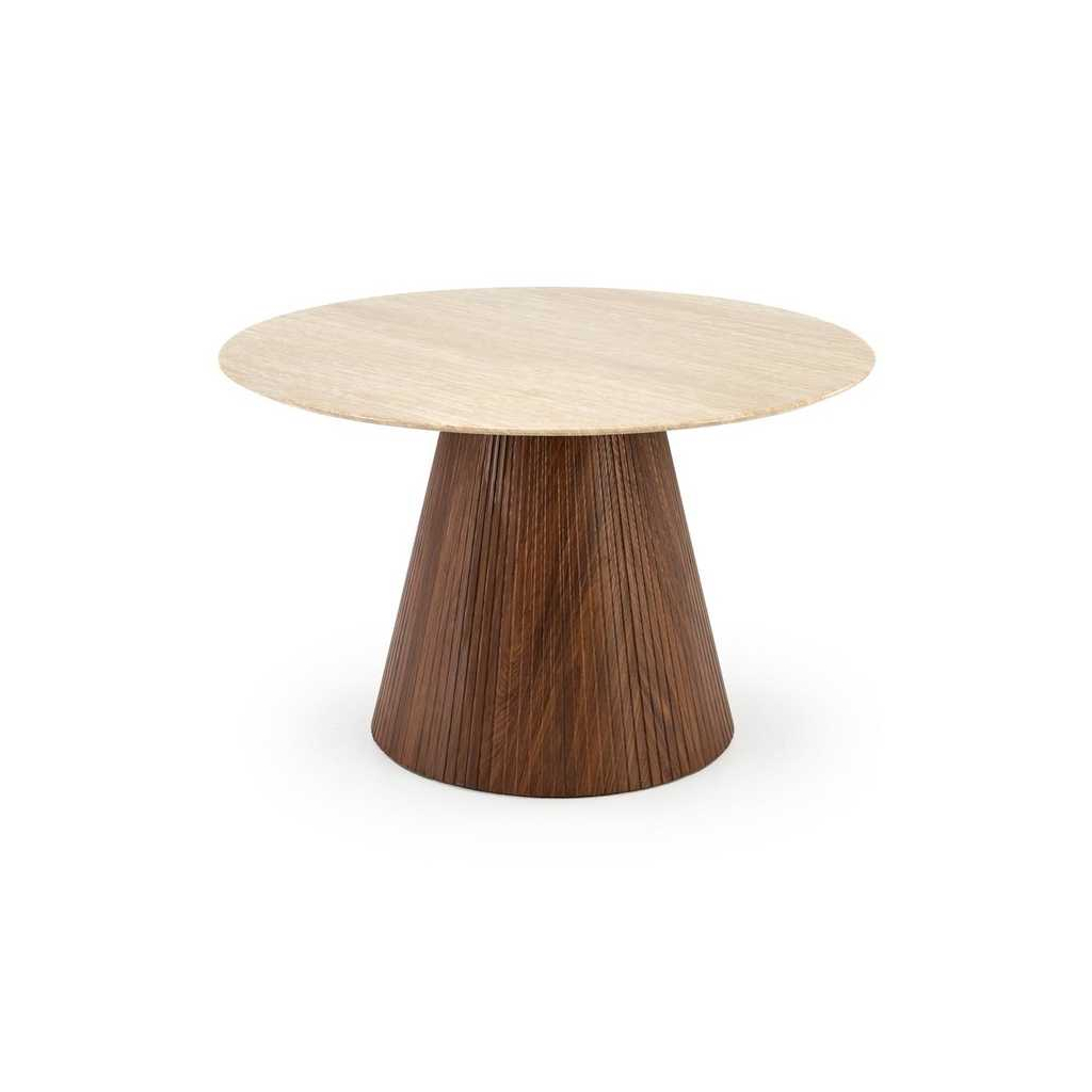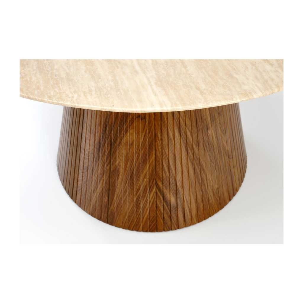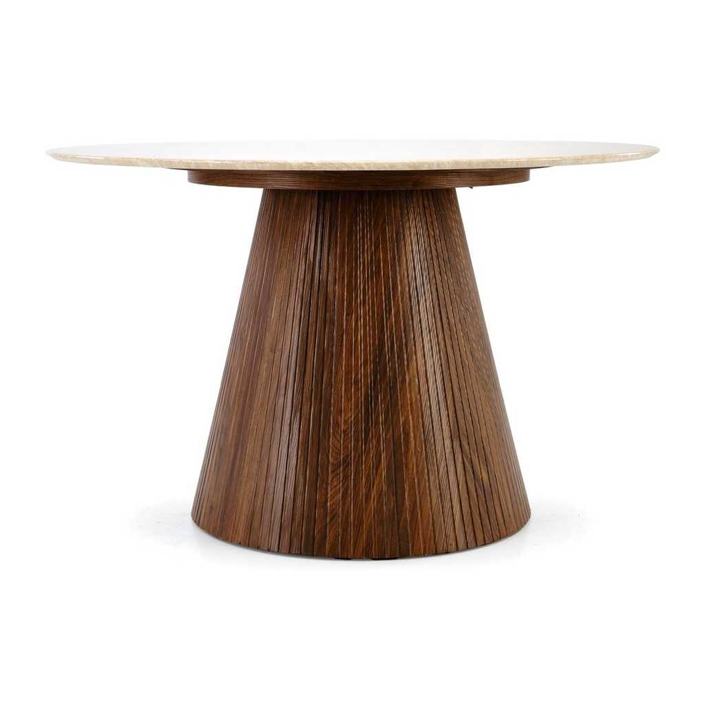 Jídelní stůl Linwood přináší kombinaci přírodní elegance a praktičnosti do vaší jídelny. Jeho kulatá horní deska z kamene nabízí pevný a snadno udržovatelný povrch, který je odolný vůči běžnému opotřebení. Podnož ze dřeva dodává stabilitu a přírodní vzhled, který skvěle doplní různé styly interiérů.