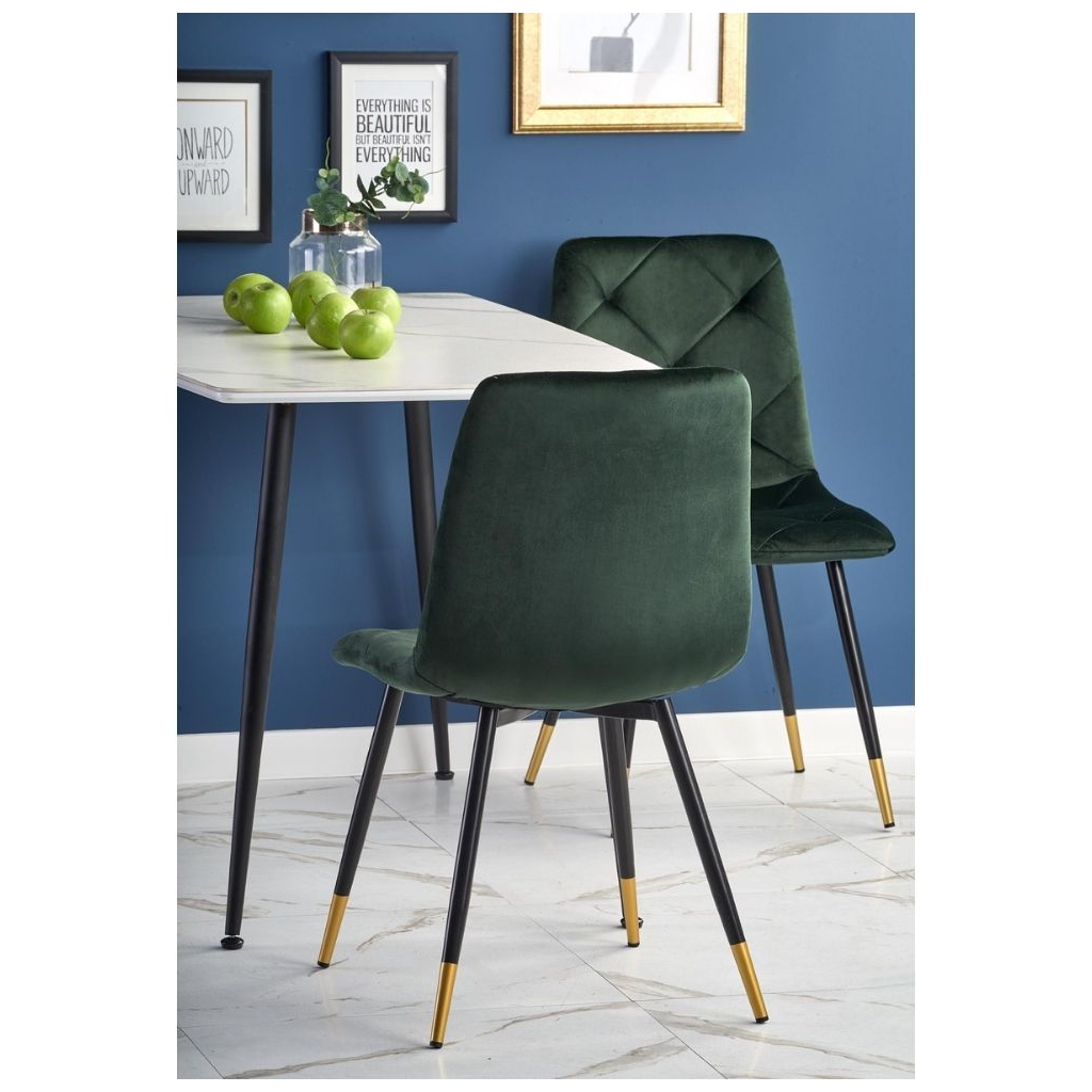 Deska stolu je vyrobena ze skla v barevném provedení imitujícím mramor. Nohy stolu jsou konstruovány tak, aby nepřekážely při sezení a současně zajistily stolu maximální pevnost. Tu umocňuje jejich provedení z práškované oceli v černé barvě.