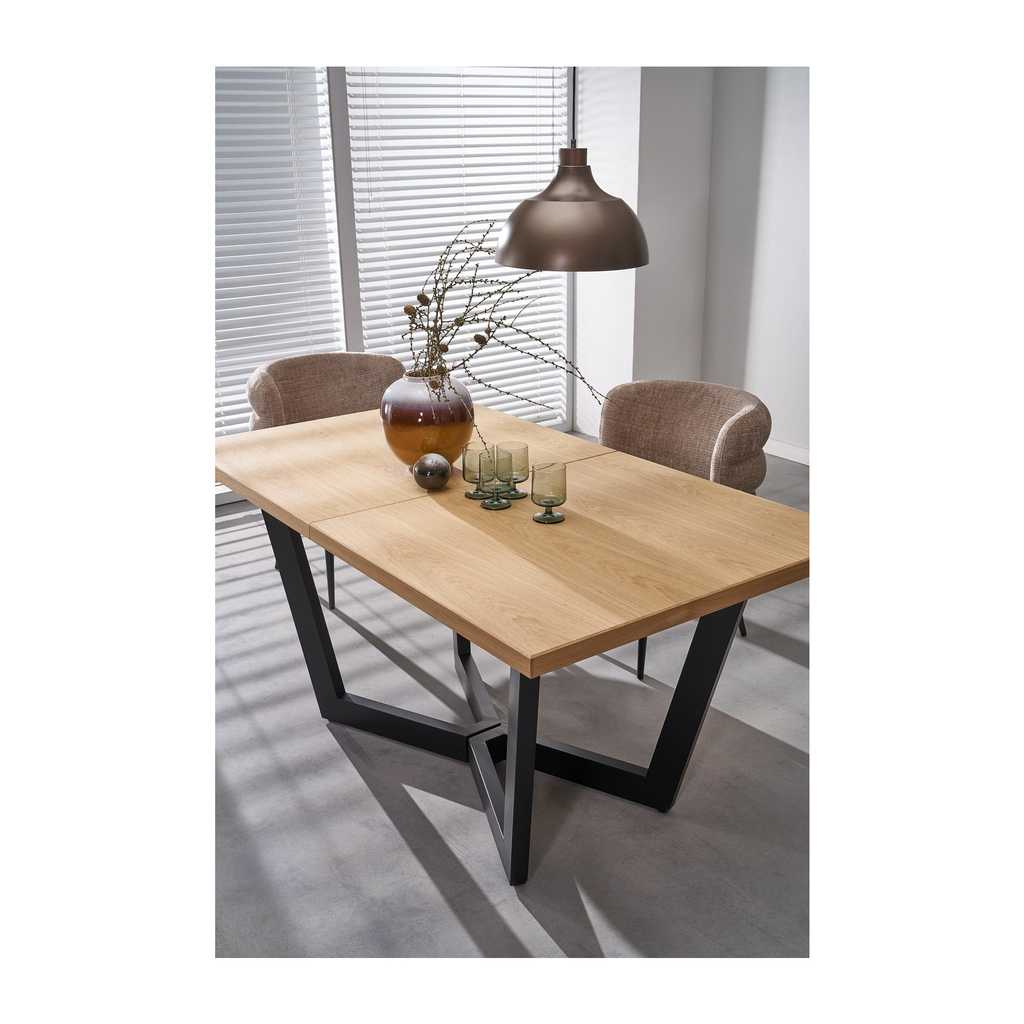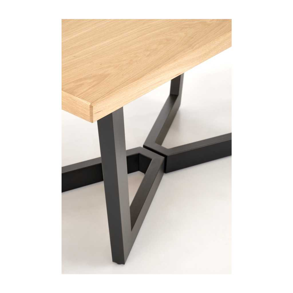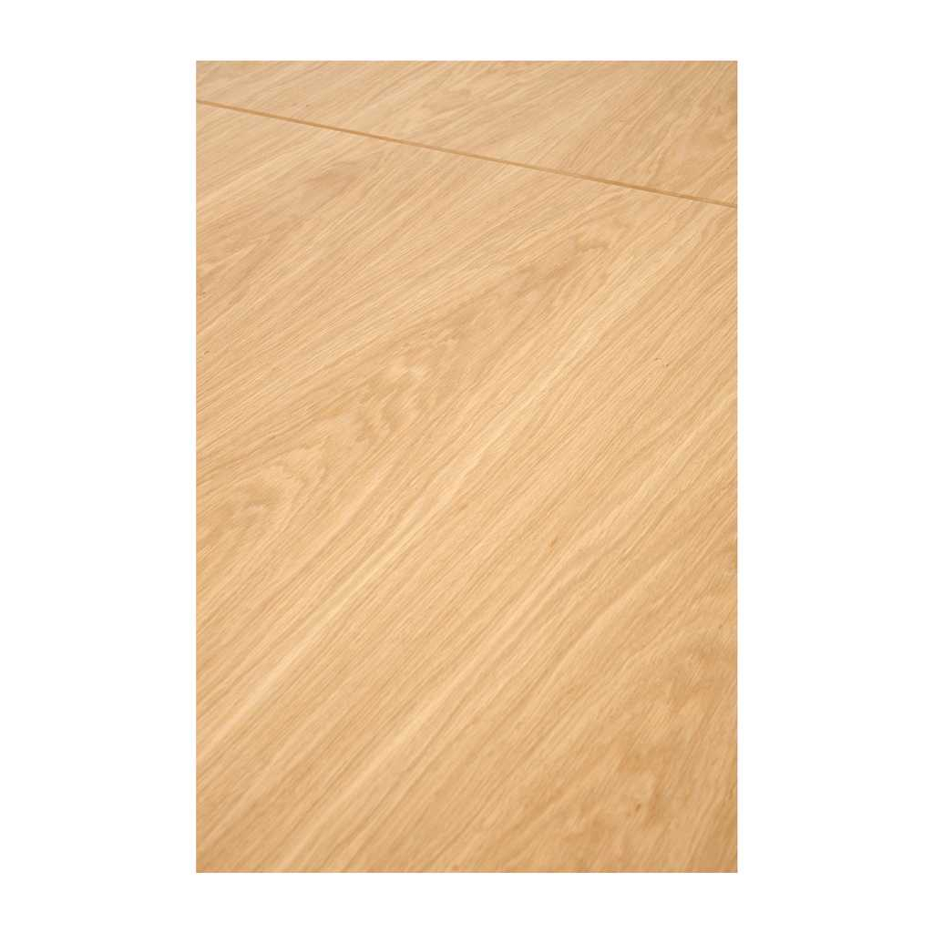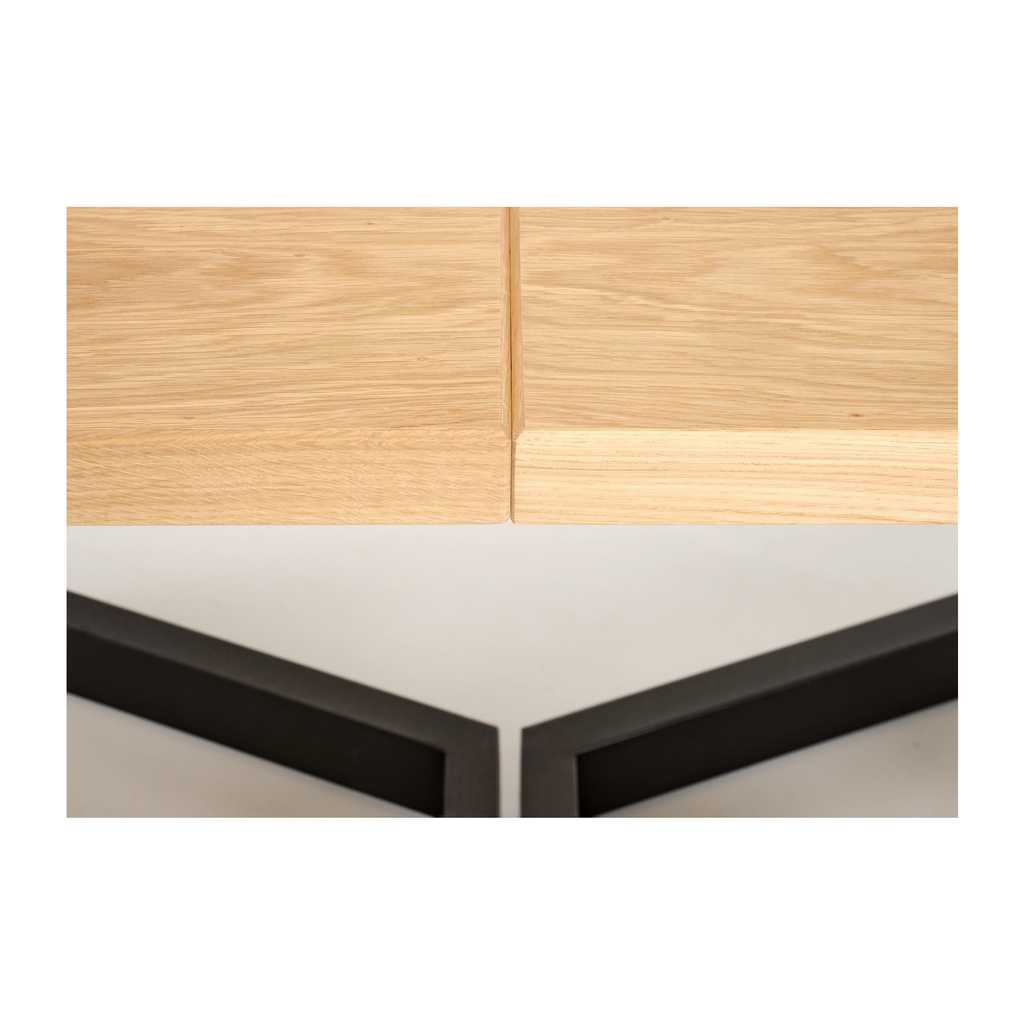 Deska stolu je vyrobena z MDF v kombinaci s masivním dřevem na okrajích v barevném provedení dub. Nohy stolu jsou konstruovány tak, aby nepřekážely při sezení a současně zajistily stolu maximální pevnost. Tu umocňuje jejich provedení z práškované oceli v černé barvě.