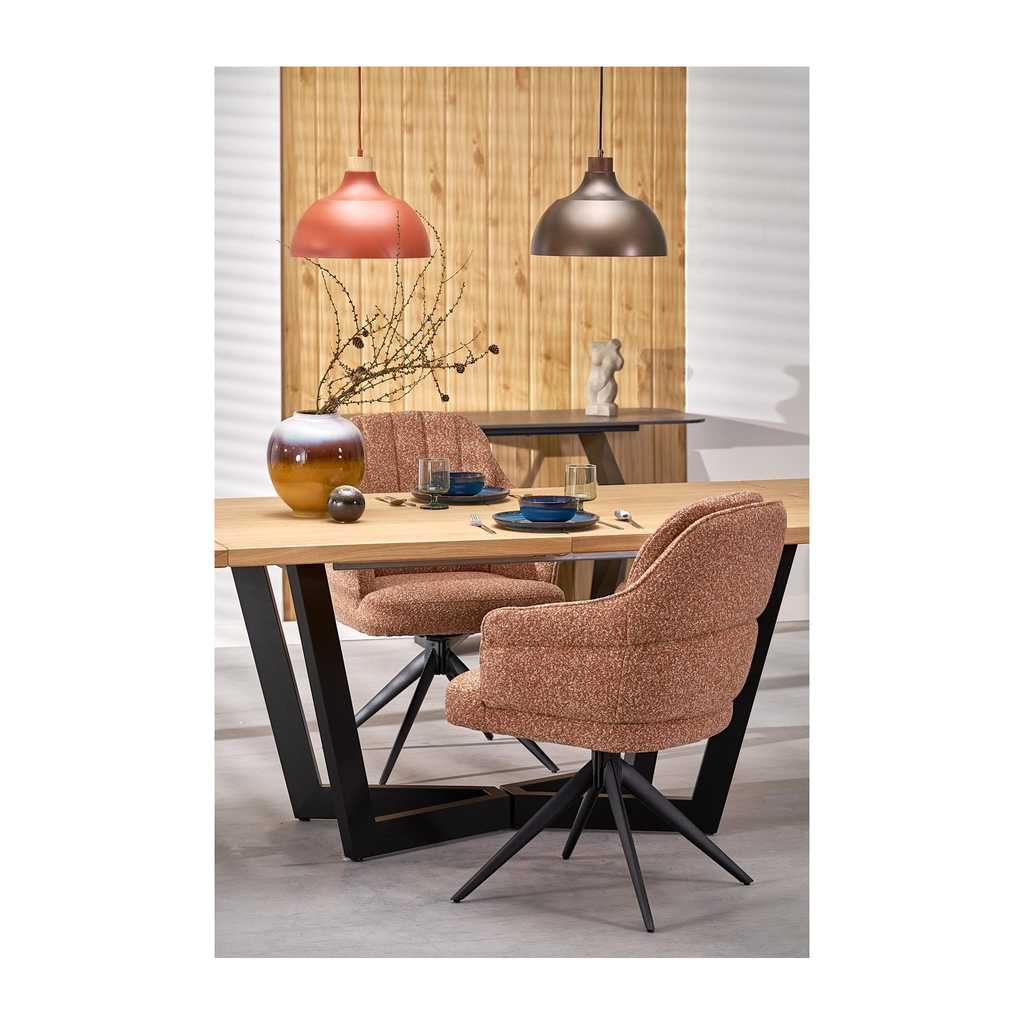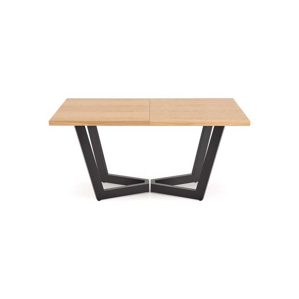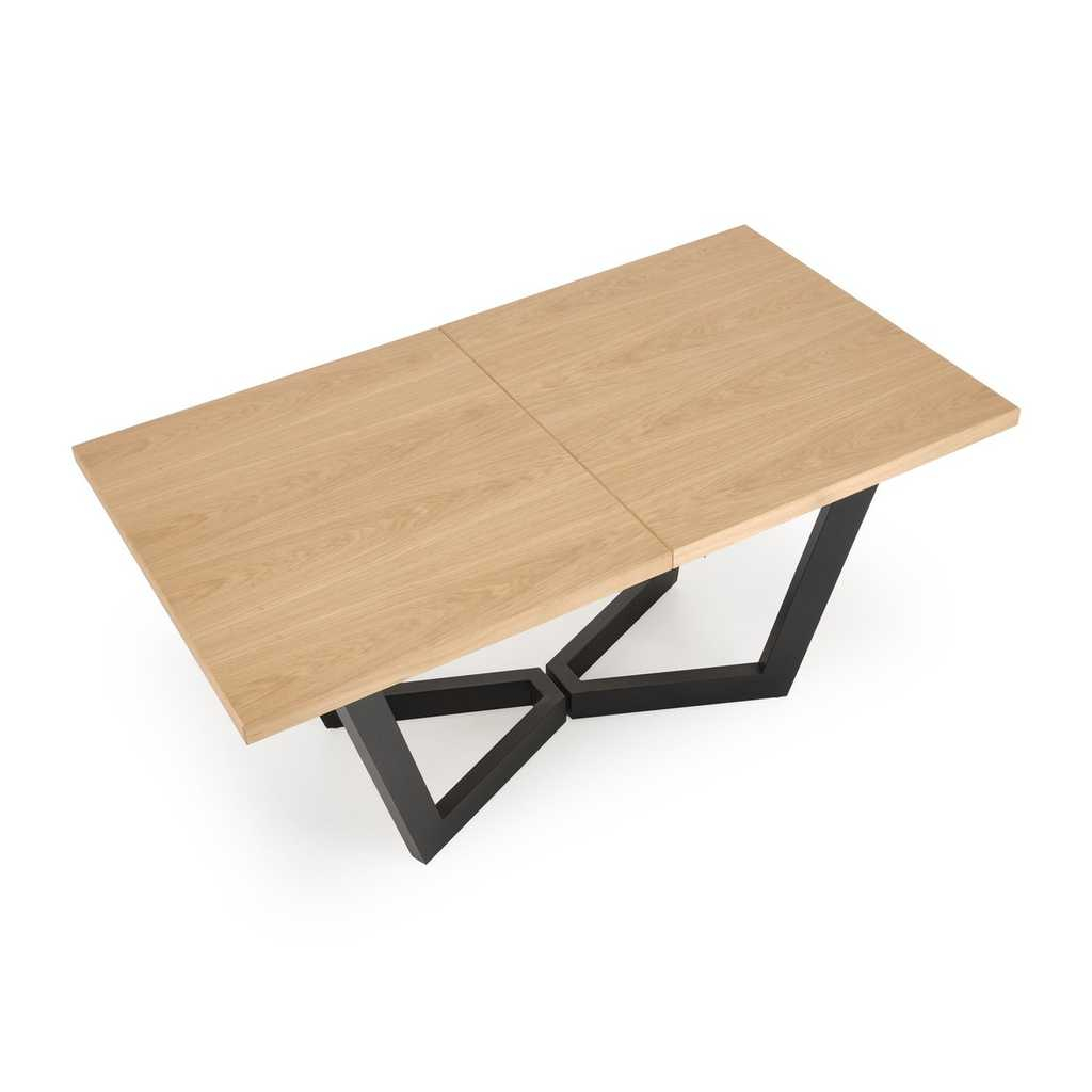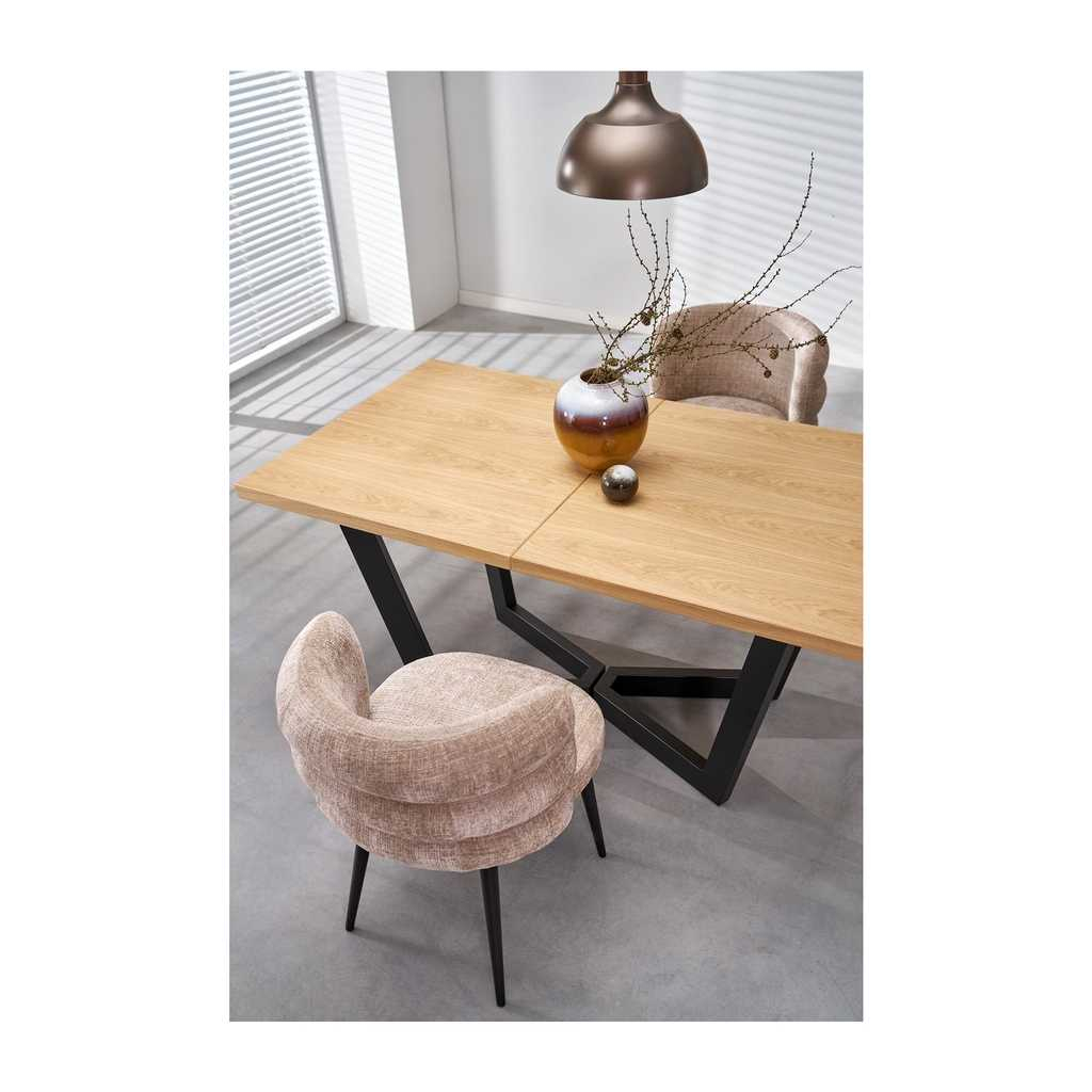Deska stolu je vyrobena z MDF v kombinaci s masivním dřevem na okrajích v barevném provedení dub. Nohy stolu jsou konstruovány tak, aby nepřekážely při sezení a současně zajistily stolu maximální pevnost. Tu umocňuje jejich provedení z práškované oceli v černé barvě.