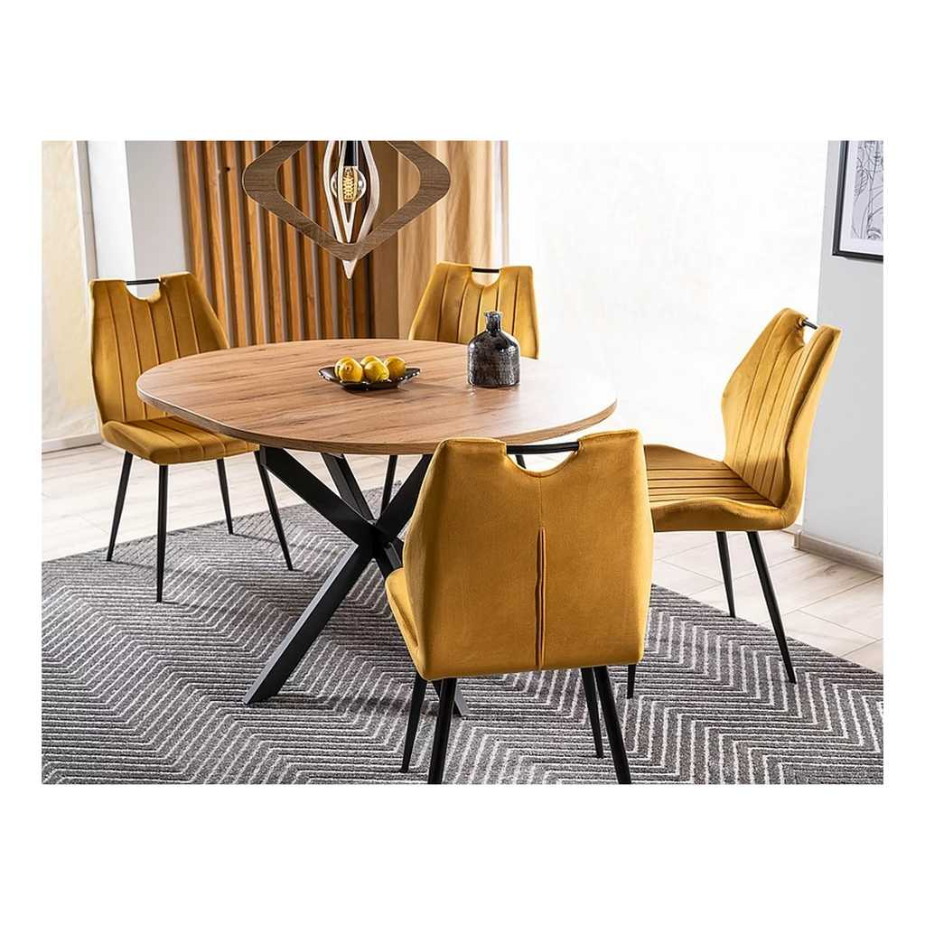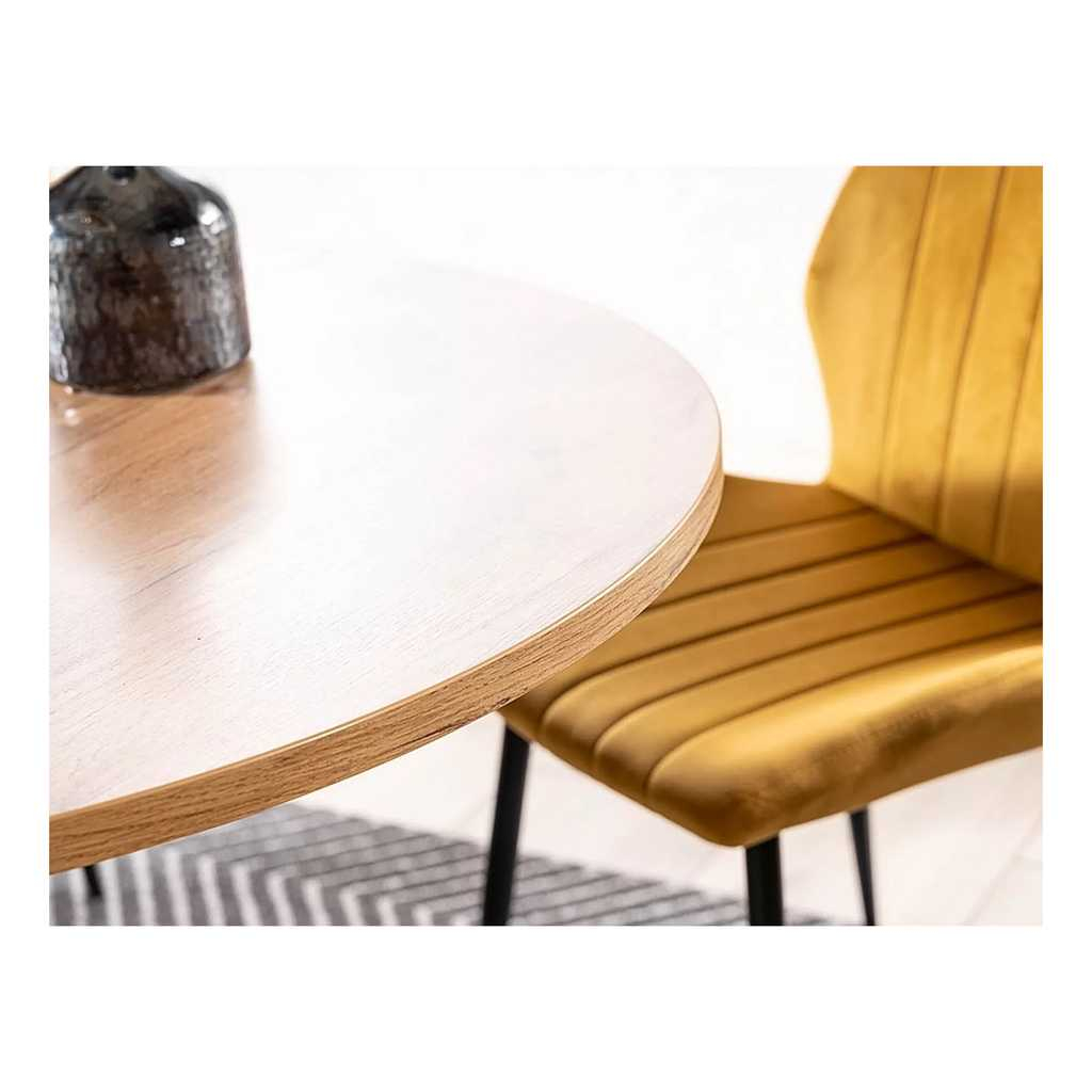 Deska stolu je z dýhovaného dřevovlákna (MDF) o síle 25 mm. Doplňuje ji elegantní kovová podnož, díky které je stůl stabilní a při rovnoměrném zatížení garantuje nosnost 60 kg. Díky zúžení ve výšce sedu je snazší pod stůl zasunout židle.