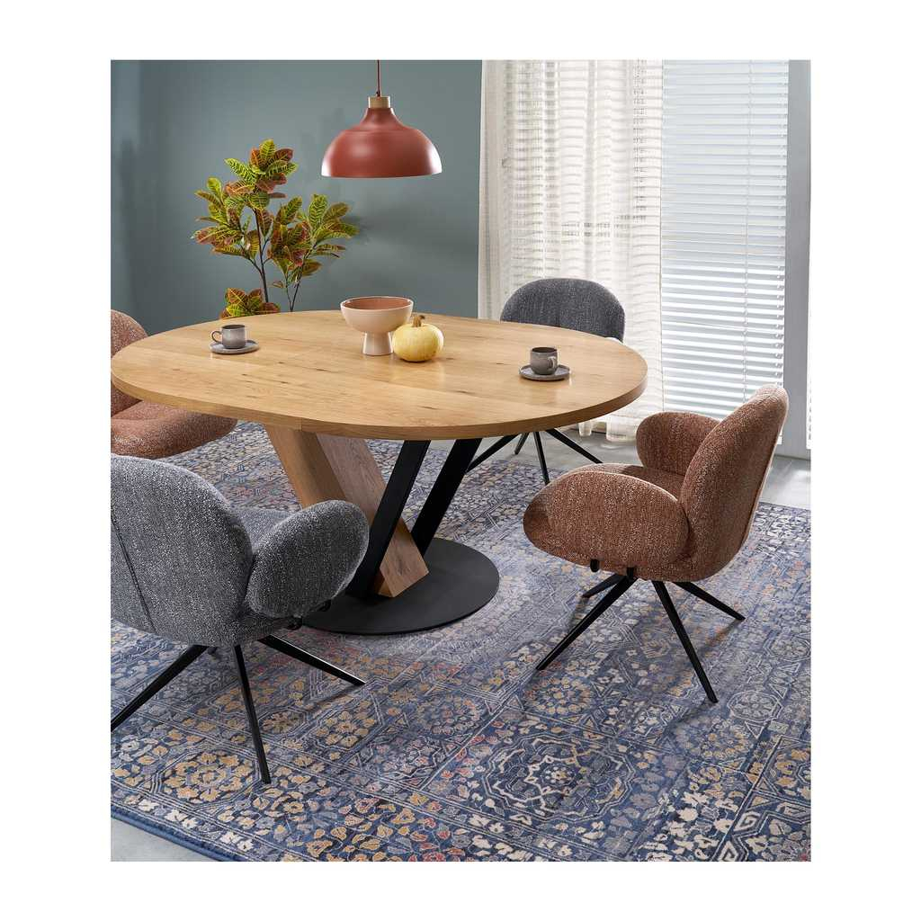 Stůl má pevnou konstrukci s kulatým oválným tvarem pracovní plochy, která poskytuje dostatek prostoru pro pohodlné stolování a společenské setkání. Výška 78 cm zajišťuje komfortní sezení a použití s běžnými jídelními židlemi.
