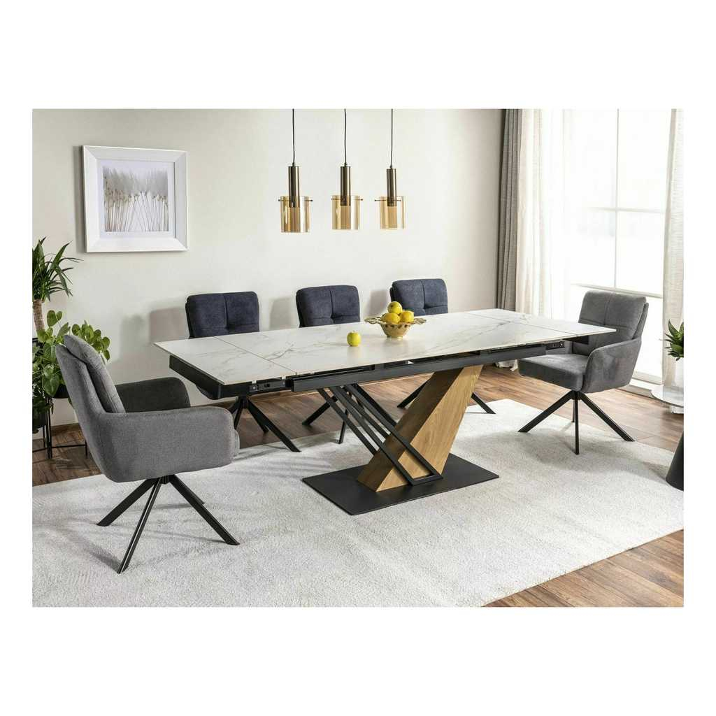 Deska stolu je vyrobená z keramiky. Ta vytváří odolný, ale i vizuálně úchvatný povrch. Efekt přepychu umocňuje dekor mramoru.