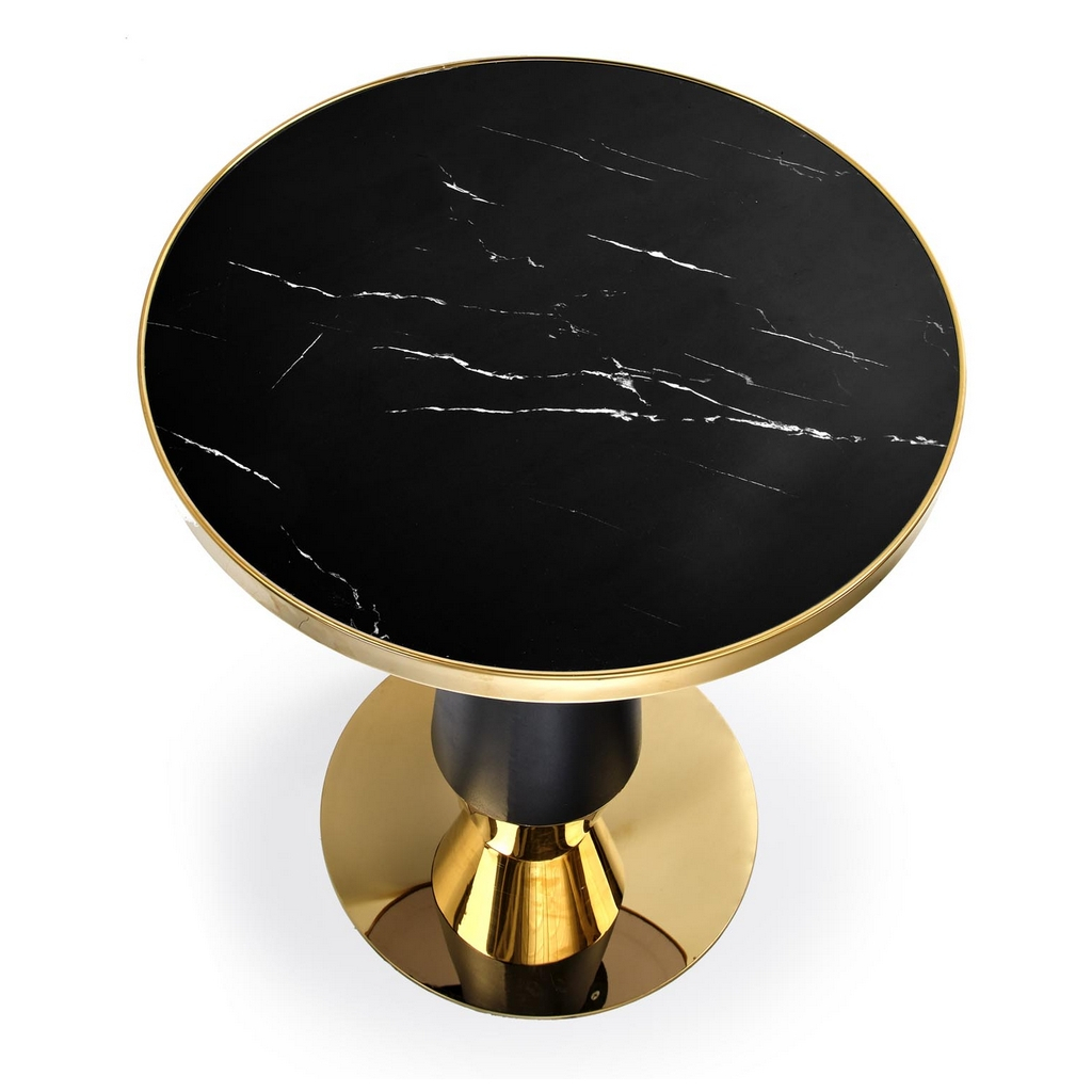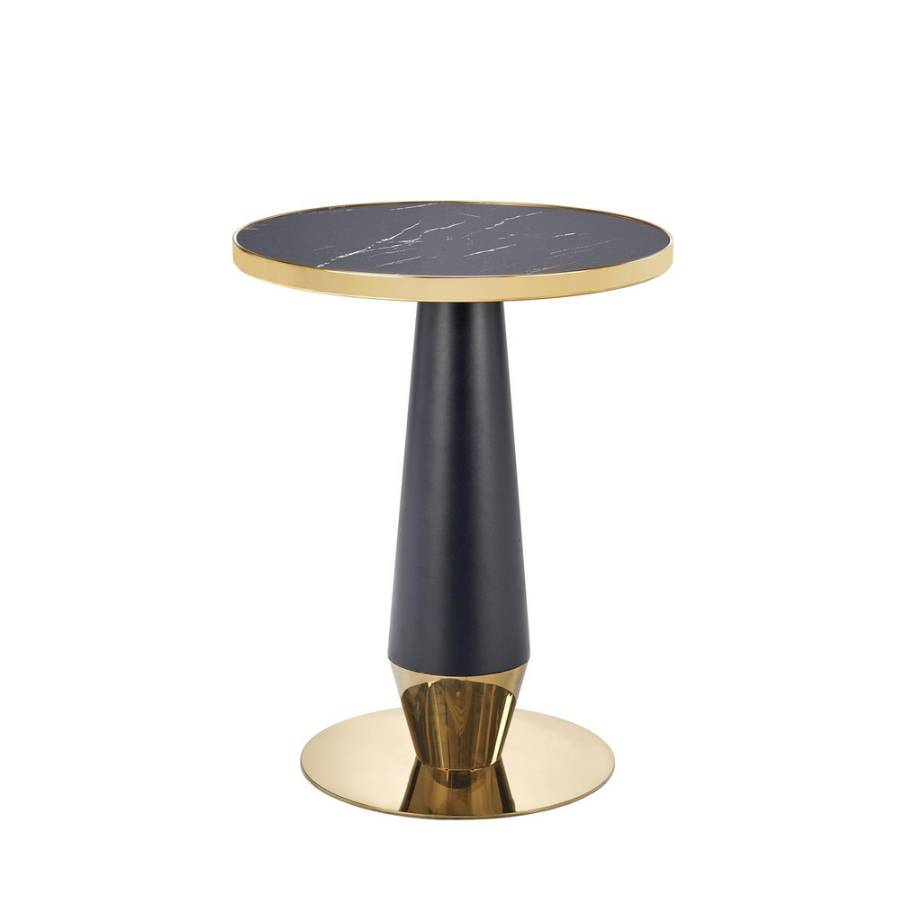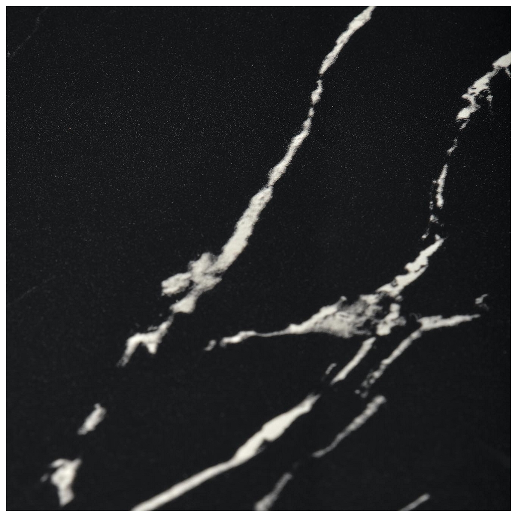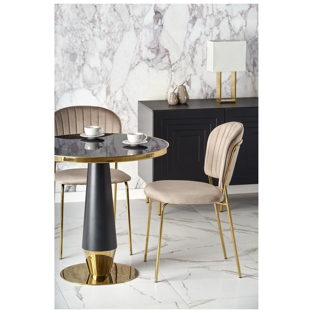 Kruhová deska má průměr 59 cm a je z keramiky se zajímavou texturou černého mramoru. Před poškozením ji chrání ochranný lem z chromované ocele ve zlatém lesku.