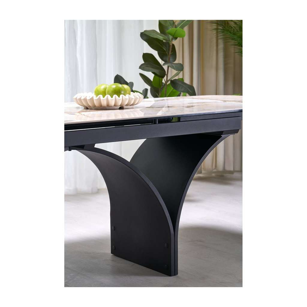 Keramická deska stolu je odolná vůči poškrábání a snadno se udržuje, zatímco robustní kovová podnož zajišťuje stabilitu a dlouhou životnost. Obdélníkový tvar poskytuje dostatek prostoru a komfort pro až 8 osob.