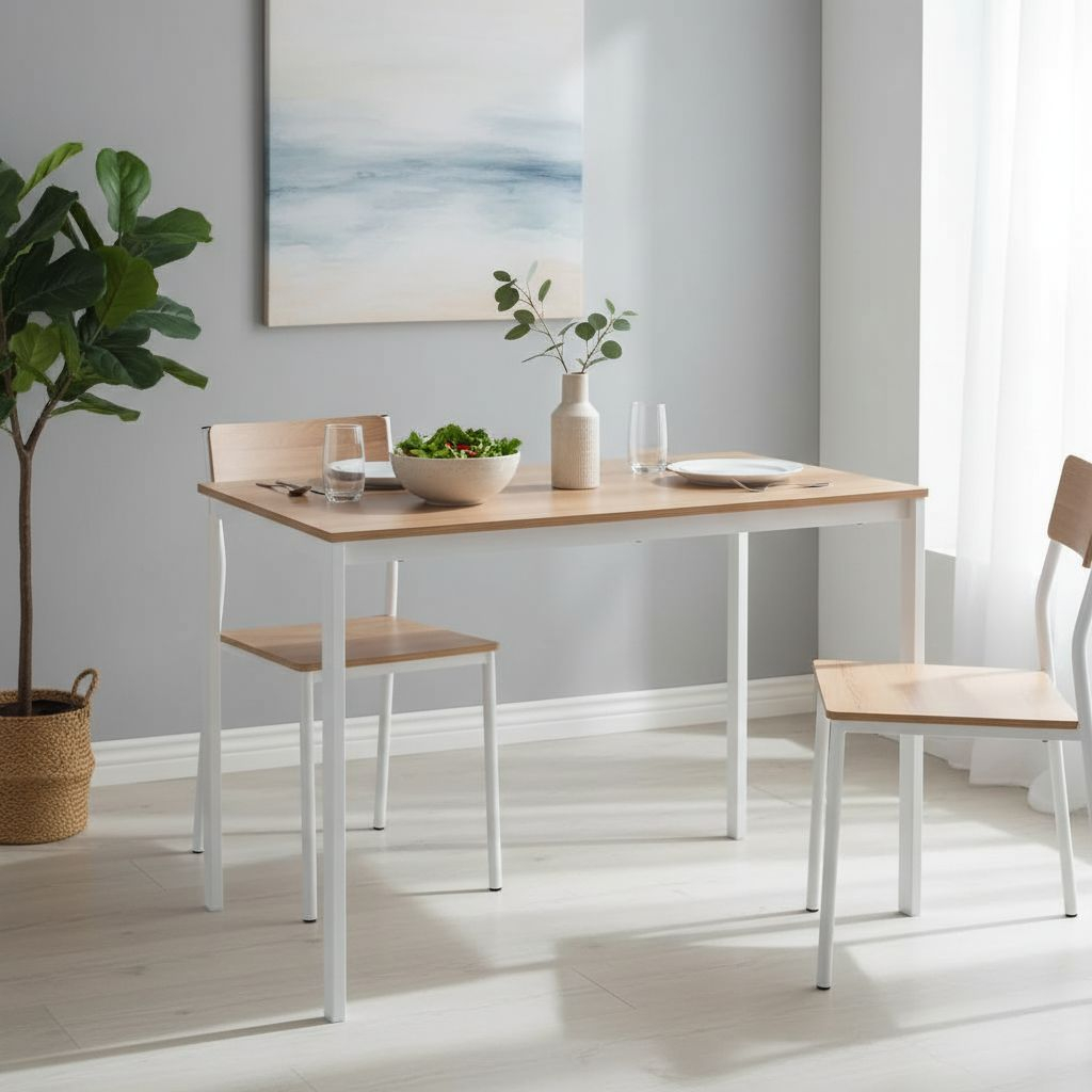 Díky kovové podnoži je stůl pevný a odolný, přičemž jeho rozměry 100 x 60 cm poskytují dostatek místa pro pohodlné stolování až pro čtyři osoby. Výška stolu 75 cm je standardní a vhodná pro většinu jídelních židlí. Nepřestává zaujmout ani jeho nízká hmotnost, která umožňuje snadnou manipulaci a přesun dle potřeby.