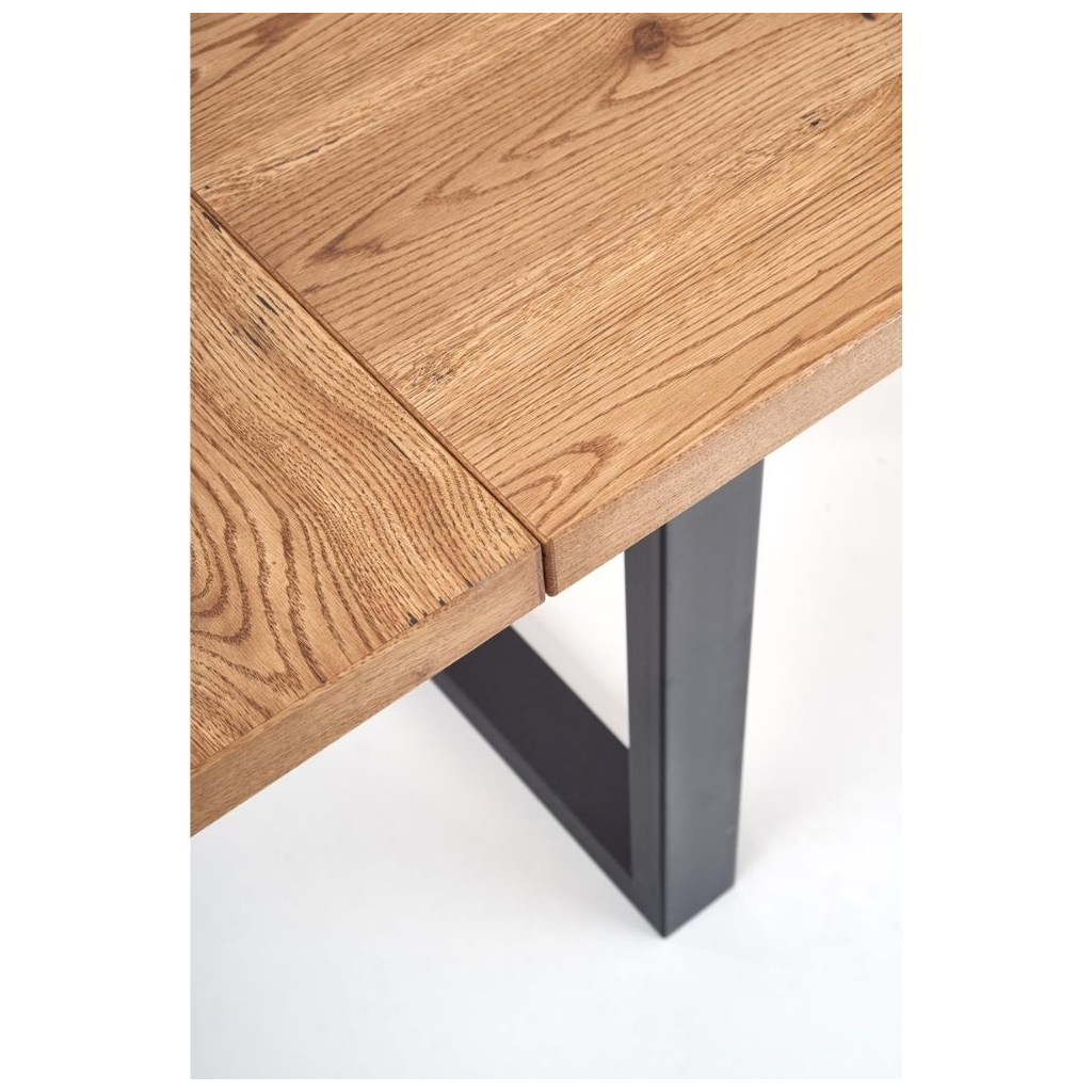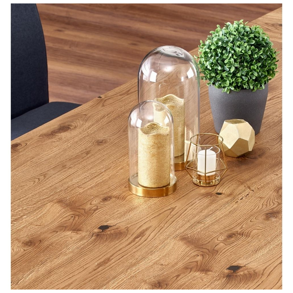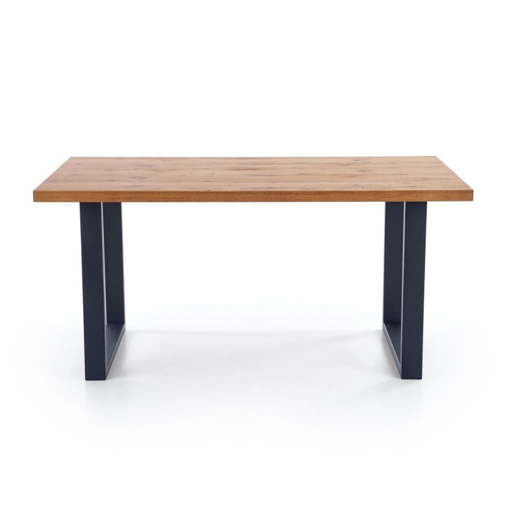 Robustní deska stolu je vyrobena z dýhované MDF v barevném provedení dub. Nohy stolu jsou konstruovány tak, aby zajistily stolu maximální stabilitu. Tu umocňuje jejich provedení z práškované oceli v černé barvě.