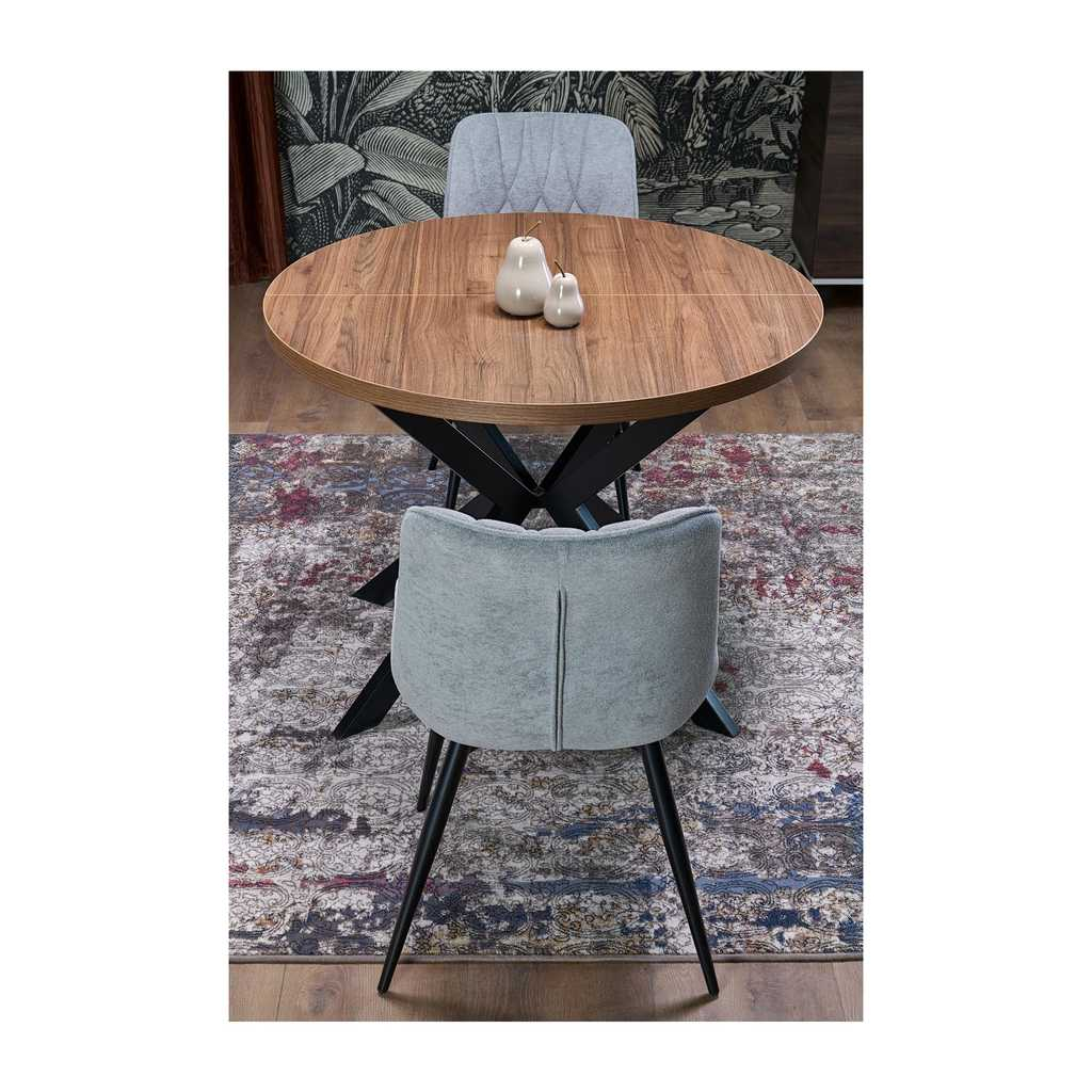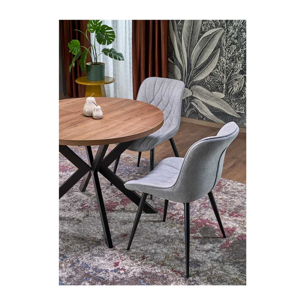 Kulatá deska stolu je vyrobena z kombinace dýhované dřevotřísky, což mu propůjčuje přírodní vzhled s odolným povrchem. Tento materiál je ideální pro každodenní používání díky své snadné údržbě a odolnosti proti poškození. Přirozený odstín dodává stolu teplý a příjemný vzhled, který krásně doplní jakýkoli moderní interiér.