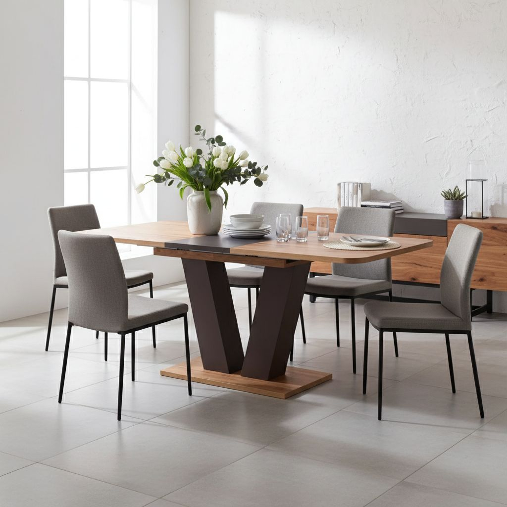 Tento jídelní stůl moderního stylu se hodí do domácností nebo i kanceláří, kde potřebujete využít jeho variabilní rozměry. Můžete k němu posadit 4 osoby, ale rozložením na délku 176 cm se vejde ke stolu až 6 osob.